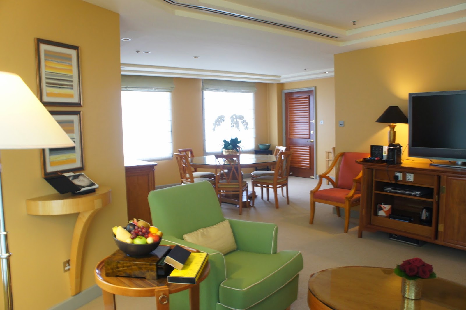 Exiting the bedroom into the main part of the suite, after the powder room, is where one can find the lounge area. Decked out with a 2 seater couch and a couple of armchairs, this lounge area is where can relax and enjoy either the view from the floor to ceiling window behind the couches or watch a show on the 46″ LED TV. Beside the couch, one can find a side table, where the hotel has placed a complementary place of tropical fruits and a couple of boxes of chocolates for guests to enjoy. In front of the couch is a coffee table. Placed opposite the couches is where one will find a cabinet with the TV on top of it. There is also a Nespresso Coffee machine on the same tabletop as the TV. Beneath the TV is where one can find a DVD player, which doubles up as radio. The entire suite was decked out in classical music from one of the radio stations to give guests a relaxing feel upon our entry to the suite. In the same cabinet, one can find a minibar well hidden from sight. There are a few drawers where glassware for one to enjoy drinks from the minibar.