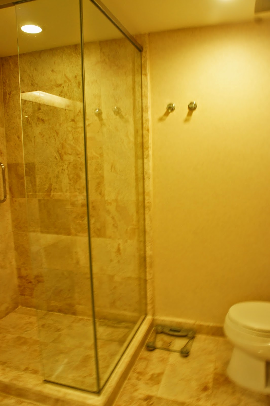Past the door that leads into the bedroom, on its left is where one can find a rather spacious wardrobe. The generously spaced 2 compartment wardrobe is sufficient for 2 pax to unpack their one’s week’s clothing into. One can find more storage space on the other compartment with 4 drawers for one to unpack into. To the right of the door, opposite the wardrobe, a marble laden bathroom greets guests. The spacious bathroom has a generous countertop on the sink area. Further into the bathroom, at the end of the bathroom, is the bathtub. Next to the bathtub is the walk-in shower. Tucked to the right of the door to the bathroom is where one will find the toilet bowl. The orange lighting in the bathroom, coupled with the marble material used to decorate the bathroom, gives one a feel of class in the bathroom.