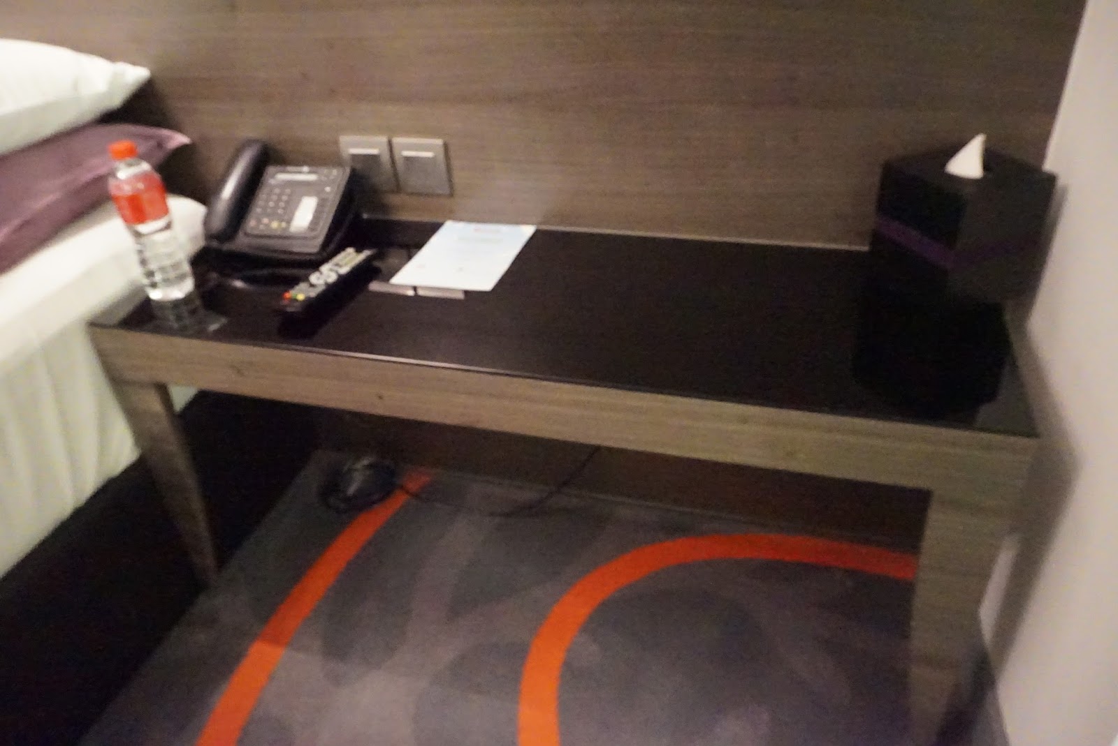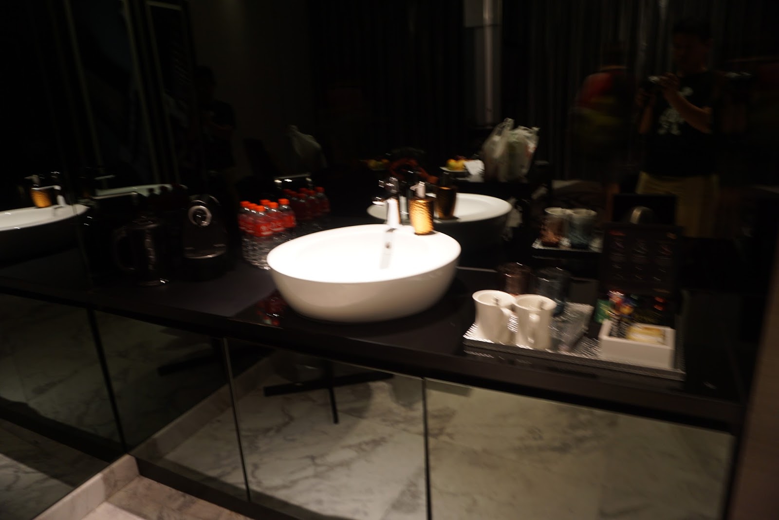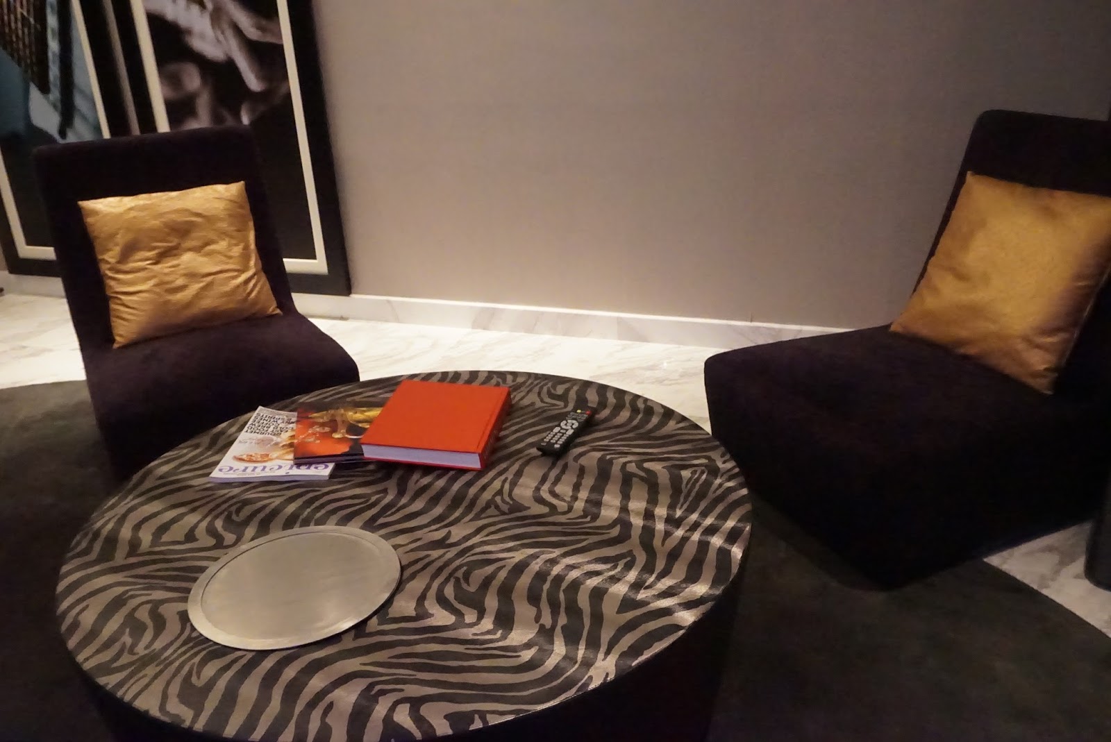 Upon entering the suite, a dark purple themed suite greets guests. The main entrance opens up to the living room of the suite. To the right of the entrance to the suite, one can find a dark themed toilet. The functional toilet houses a toilet bowl and a sink. I find this toilet a tad dark. Further into the suite, one can find a black dining table with two chairs tucked by the wall to the suite. Next to the dining table is the mini bar area, with a small bar fridge well hidden in one of the three cabinets. On top of the cabinet is a huge countertop with a sink located in the middle of the countertop. A Nespresso machine and kettle is placed on the left of the sink, while the cups and Nespresso capsules, as well as the coffee and tea, are placed on the right of the sink. One can find two purple single-seat armchairs located further into the living room of the suite. There is a huge coffee table placed in front of the armchairs. A LED TV is mounted onto the wall in front of the armchairs. The wall separating the living room and the bedroom is mounted with dark mirrors, which makes the suite looked bigger. I liked the high ceilings in the living room of the suite, making it feels bigger. However, I do find the suite a little bare without a 2-seater couch, making the living room look under furnished. The absence of a couch also discouraged guests from spending more time in the living room, as the armchairs are a tad uncomfortable to laze in. I spent most of my time in the bedroom of the suite. There are artefacts of rock stars apparent throughout the entire suite.
