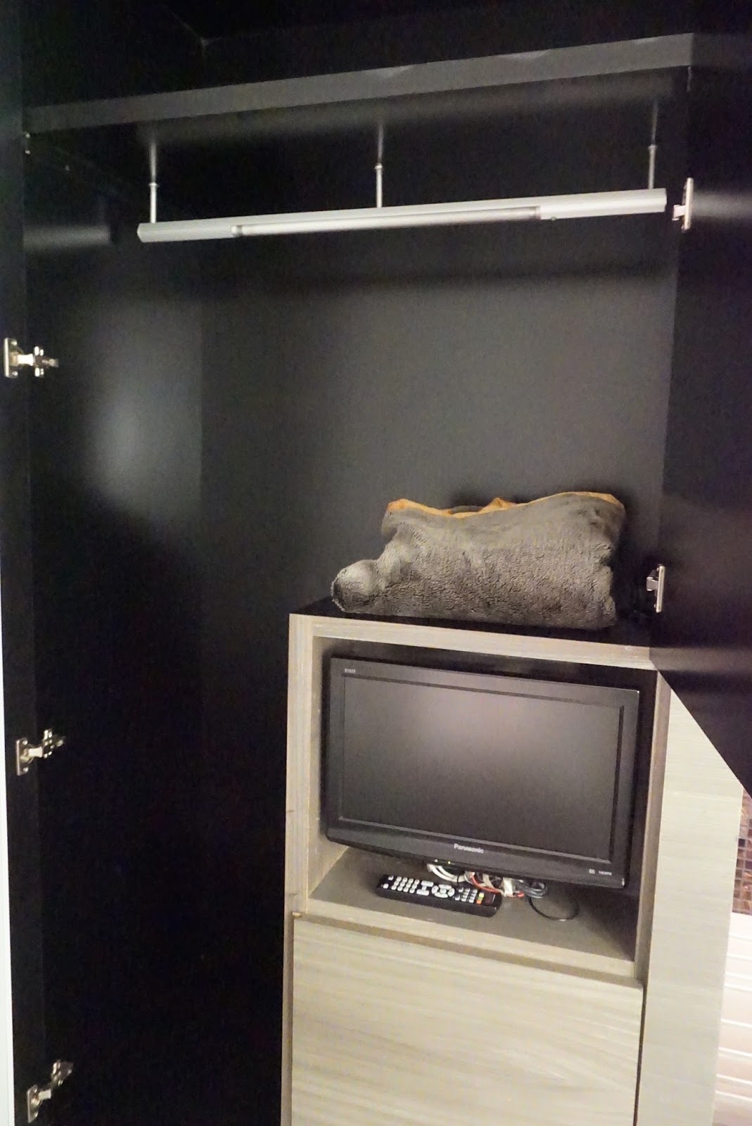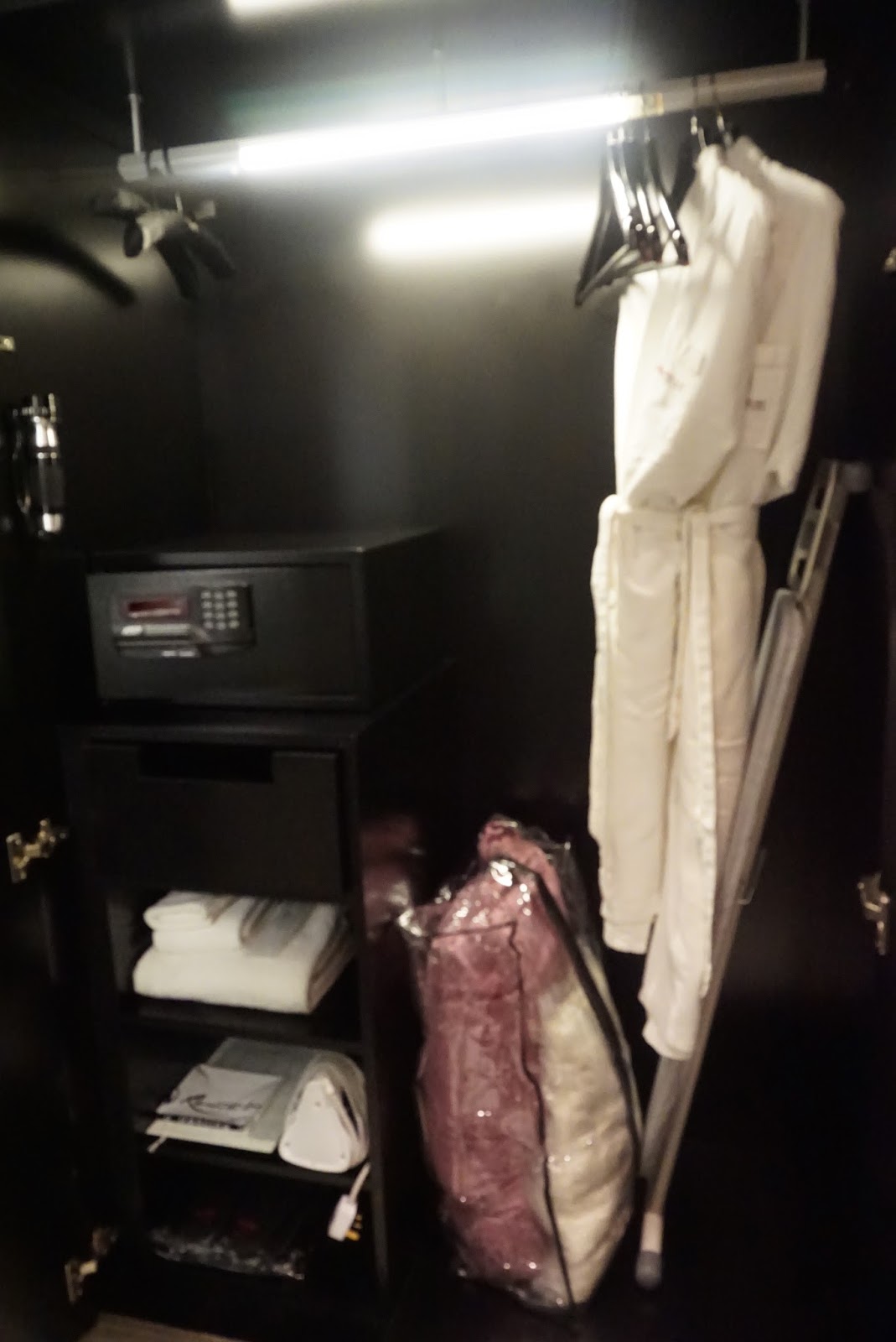 | Wardrobe outside the toilet cubicle. Guests can find bathrobes and extra blanket and pillow here together with the in-room safe. Together these wardrobes provide ample space for guests to store their clothing |