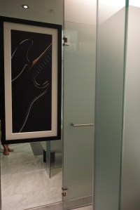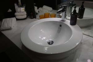 Separated by a panel of translucent glass from the bedroom is the bathroom. The bathroom feels a tad cramp compared to the bedroom and the living room. As one enters the bathroom, one can find the bathtub sitting on the right of the entrance to the bathroom. The bathtub is rather large, sufficient for two to have a romantic soak in. Opposite the bathtub, by the entrance to the bathroom, tucked into part of the wardrobe is where guests can find a small TV. Despite having a remote control here (there are three remote controls in the entire suite, one for each TV), I was unable to switch channel using the remote control. It seems that the channel on this TV is a duplicate display from the TV in the bedroom. There is no lack of wardrobe space in the bathroom, guests are treated to two large wardrobes in the bathroom. The safe and extra pillows and blankets, as well as iron and ironing board, can be found in the wardrobe further from the entrance to the bathroom. I find it a tad weird and somewhat inconvenient for the wardrobes and a ledge for guests to stow their luggage to be located in the bathroom. Having the wardrobe with the rest of the bathroom fixtures makes the entire bathroom feels cramp. Next to the bathtub is a single sink, decked with a large Hollywood styled mirror. There is ample space for two to stow their toiletries on the sink area. There is an outlet for guests to charge their electric shaver, however, it does not seem to work in the suite that I was assigned to. Next to the sink, between the sink and the bathtub is where the walk-in shower is located. The walk-in shower has both the regular shower head as well as the rain shower. I find the water pressure to the rain shower head is a tad weak. When I first entered the suite, towels are placed inside the walk-in shower area on one of the three glass shelvings, which I find it weird as the splashes from the shower would have the towels wet. Behind the sink area, in front of the wardrobe furthest from the entrance to the bathroom is where one can find another toilet cubicle. There are no lack of handles in the bathroom area for one to hand their towels to dry.