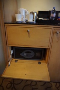 | The safe is well hidden below the electric kettle |