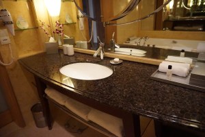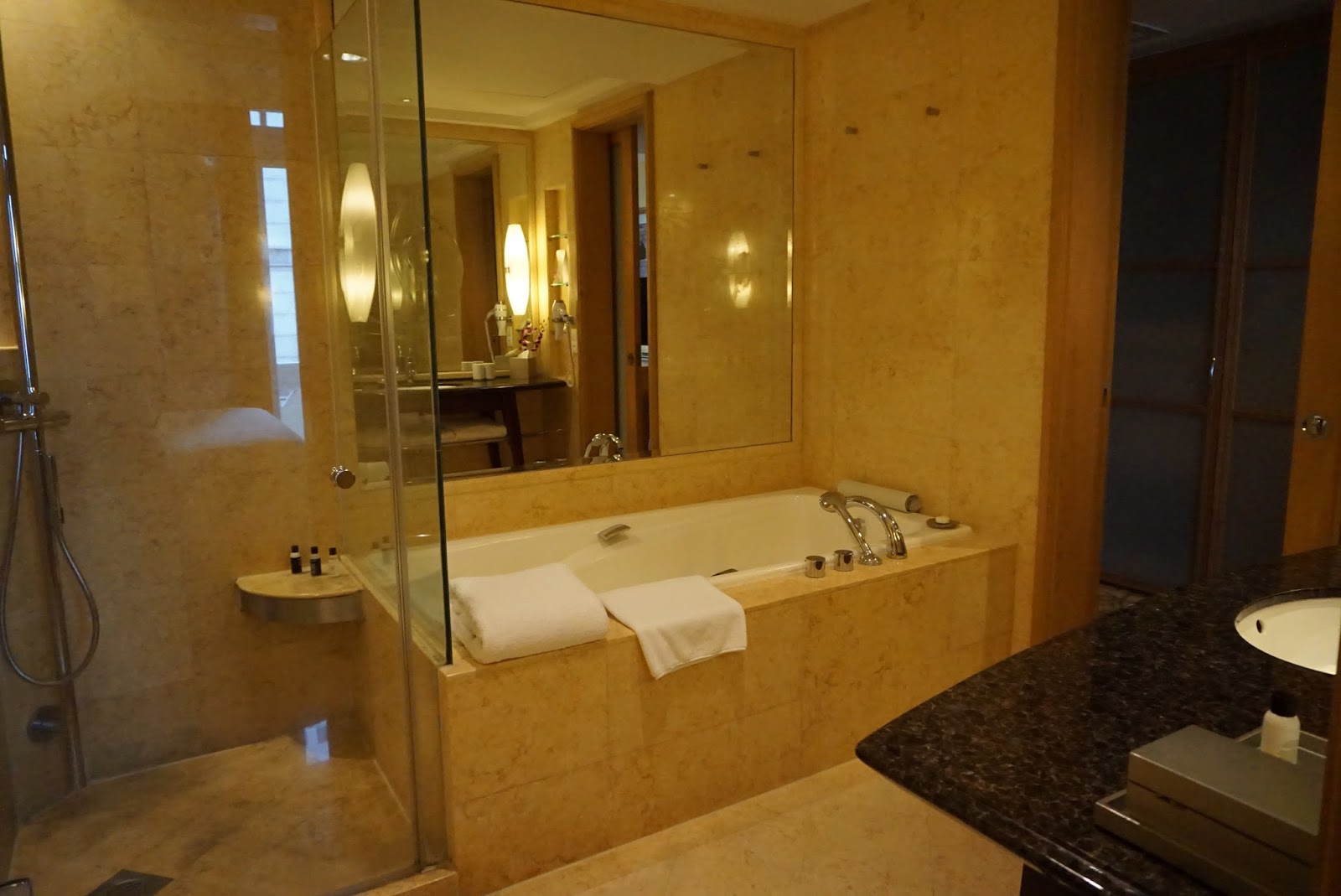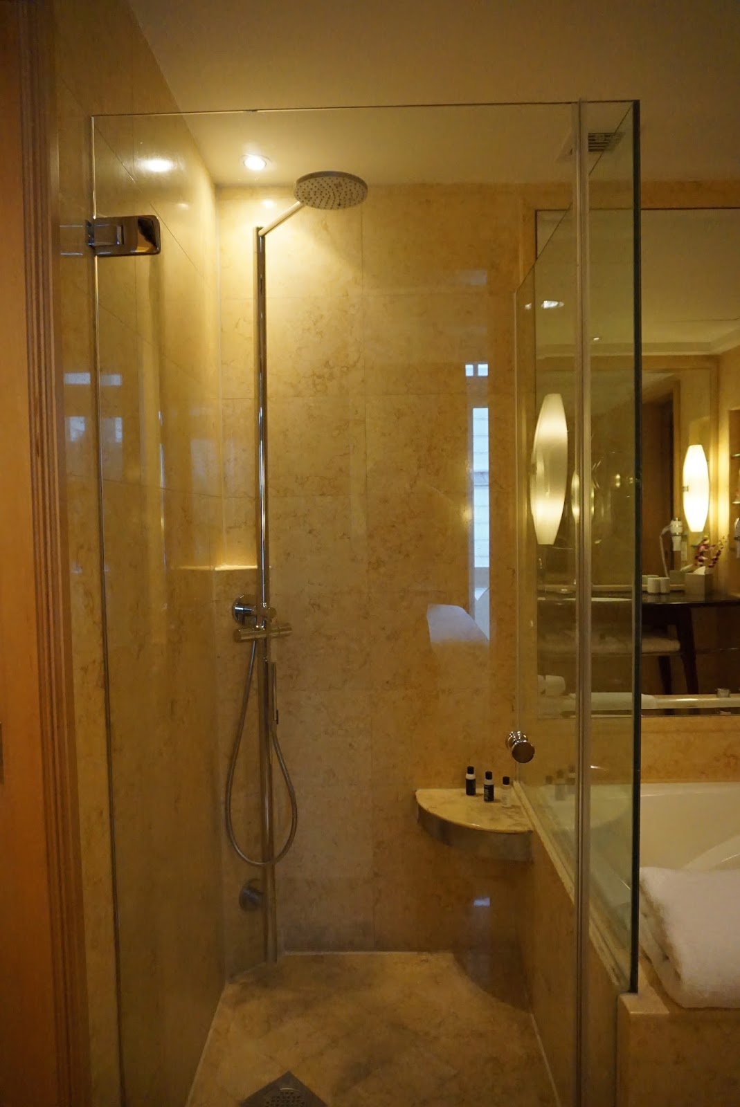 The bathroom is located opposite the wardrobe and next to the entrance. The marble laid bathroom is rather spacious. There are two entrances to the bathroom, one by the main entrance and another next to the King bed. There is a large bathtub opposite the sink top, tucked in a corner of the bathroom. The sink top has ample space for guests to place their toiletries. There is a three-tiered shelf carved out of the wall that provided additional storage space. Next to the bathtub is a walk-in rain shower stall, enclosed by glass providing a wet and dry area. I like hotels that designed their bathrooms with a separate walk-in shower, which not just make showering easier (without the need to climb in and out of the bathtub for shower), it also separates the wet from the dry area. This means the wet flooring in the bathroom is kept to the minimum. Next to the shower is a toilet cubicle, which comes with an additional door.
