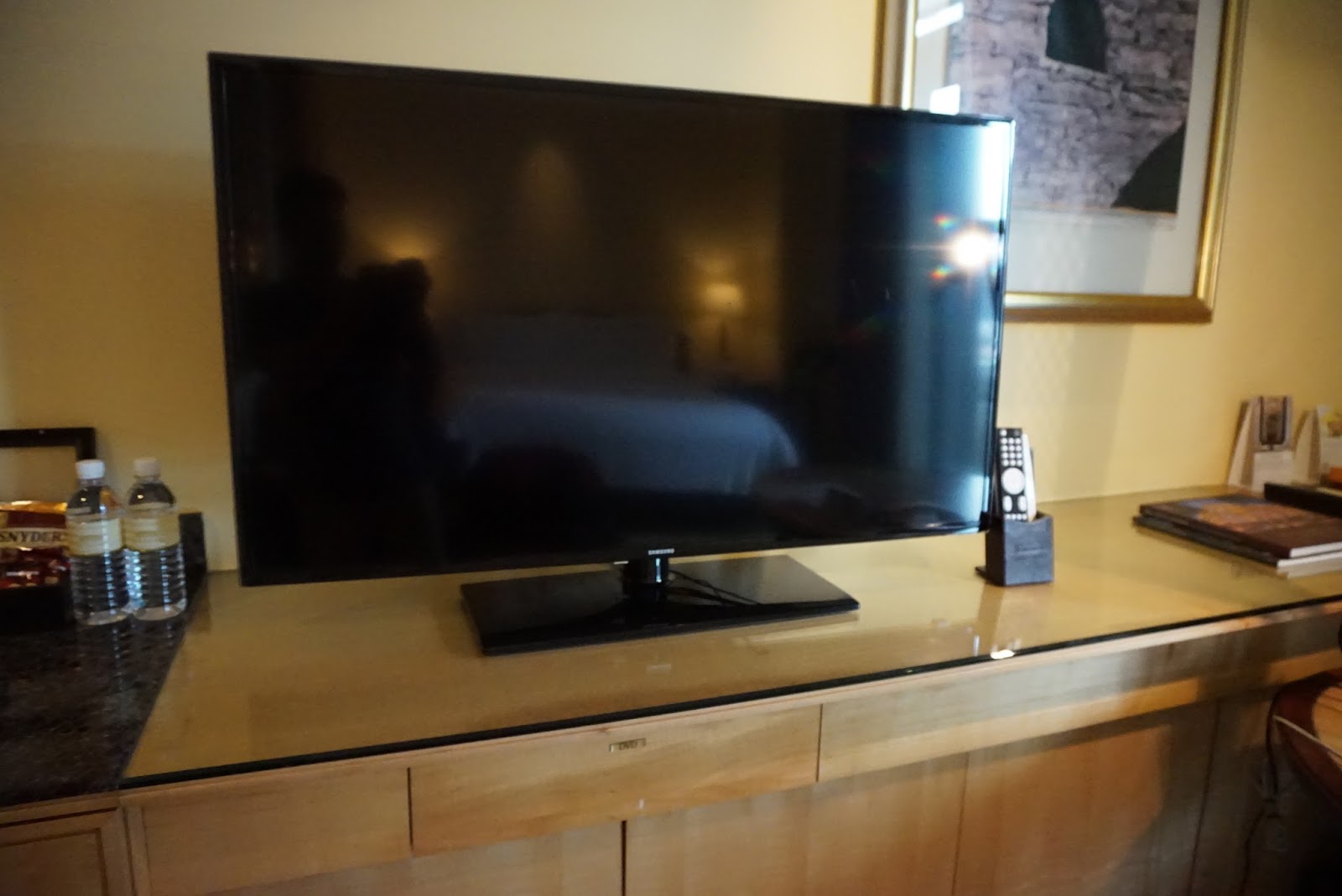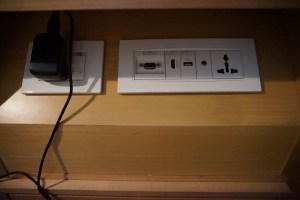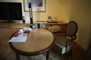 With the wall that makes up the bathroom opposite the wardrobe creates a small corridor that leads guests into the room. Stretching from the wardrobe through the entire depth of the room is hip height cabinet, using the same coloured wood as the wardrobe the hotel was able to achieve consistency in the colour scheme of the room. This makes the room look comfortable and not too confused with the minimum use of colour schemes in the room. This cabinet houses the mini bar fridge as well as a safe nicely hidden away from sight. Right smack on the centre of the cabinet is the 42″ LED TV, which is placed directly opposite the King Bed. Facing the main entrance to the room, tucked away in a corner is where the work desk is located. The work desk is rather sizable and doubled up as a dining table for me during my stay there. On the work desk, the hotel provided a mobile phone which guests can use as a mobile wifi device. Local calls on this mobile phone are complimentary from the hotel. There are also various media inputs located next to the work desk for one to plug in their lifestyle devices to be projected from the TV. There are several options in the menu of this TV, including movies which are chargeable. Otherwise, guests can choose from the many local and international channels for entertainment.