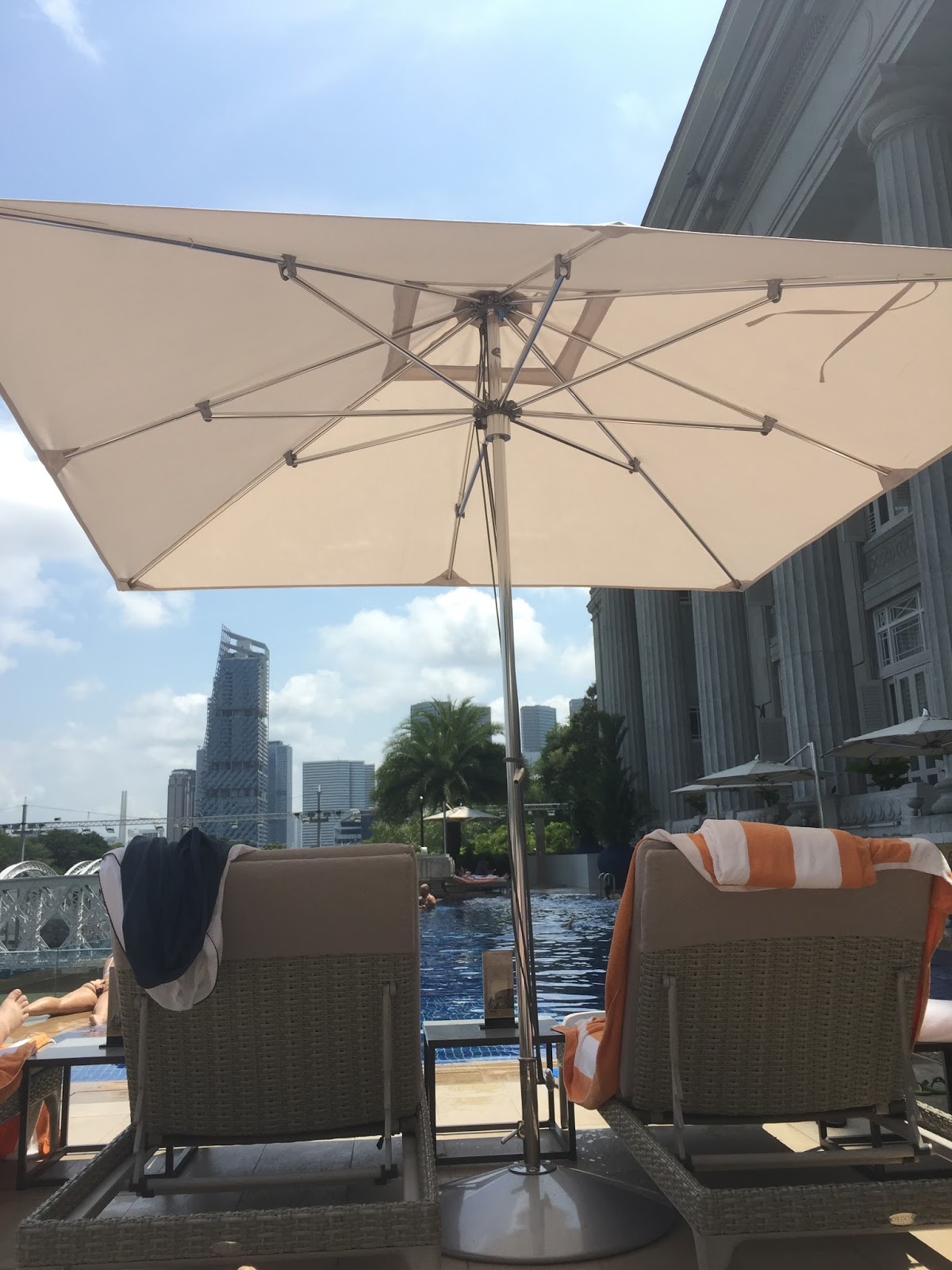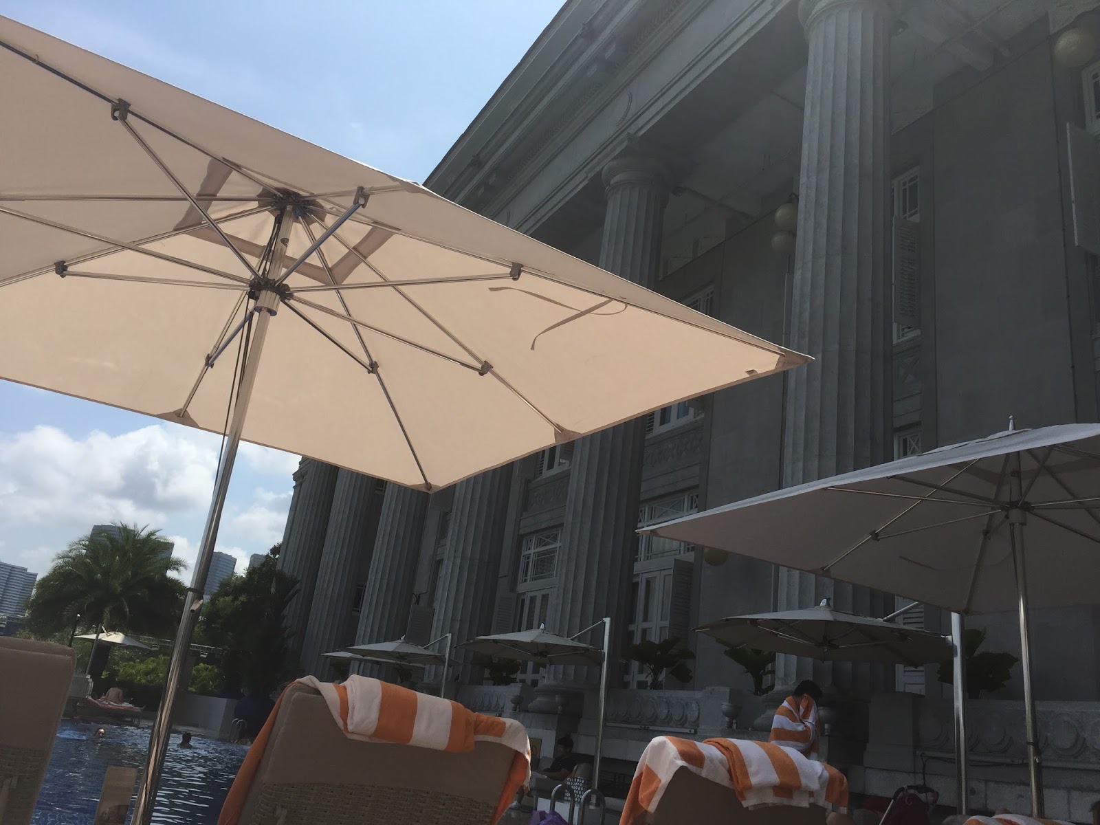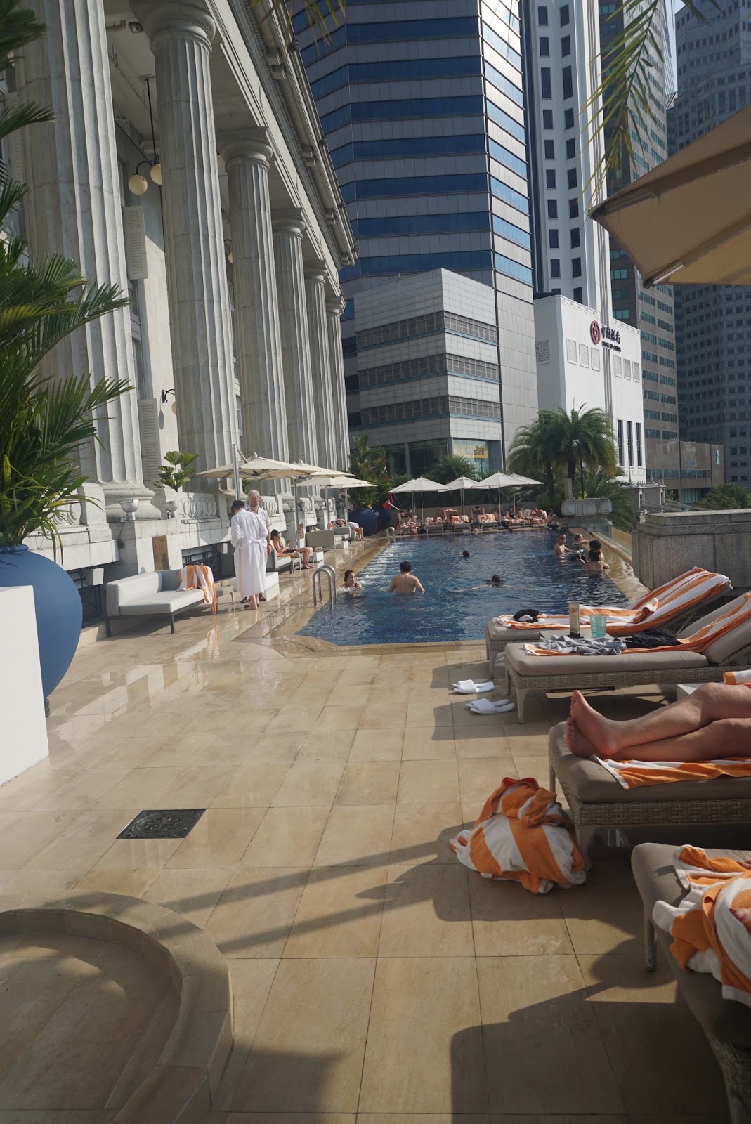 The swimming pool in The Fullerton Hotel is located on the 2nd floor. The 25m infinity pool, overlooking Singapore River, is rather small. There is a Jacuzzi area built in the pool. The number of sundeck chairs available is rather limited. On a busy day, one can forget about visiting the pool. The Fullerton Hotel allows guests to use the pool at the adjacent sister hotel, Fullerton Bay Hotel. However, one is expected to walk about 5 mins to Fullerton Bay Hotel. There is a bathroom next to the swimming pool, where lockers are available. There are a sauna and a steam room inside the gent’s bathroom.