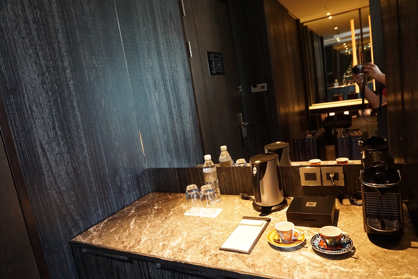 The Closet Area is what one would see when entering the room, stretching the entire width of the room. A wooden theme spreads out the entire area. To the left of the entrance is where one can find the minibar area, housed in a generous cabinet that does not occupy too much space. A Nespresso machine complete with two capsules replenished daily and electric kettle is placed on the countertop of the three-panel cabinet. A small fridge is well hidden in one of the three panels. Cups and wine glasses are also stowed neatly in the other two panels. The closet area is to the right from the entrance of the door to the room. This area, separated by a false wall, doubles up as a walk-in closet (there are door panels to the wardrobes). At the end of the area is a powder table, complete with a chair, for female guests to put on their make-ups. There are two large-sized wardrobes in this area, one with drawers and the in-room safe. There is no lack of wardrobe space in this room, capable of taking up weeks of clothing. I find this space very practical and gave me a sense of extra space in the entire room.