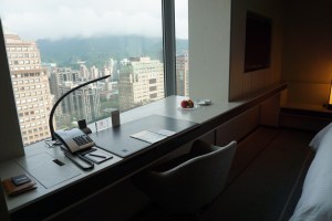 | Work desk in front of the large window panel, which allowed natural light into the Premier Room in Humble House Taipei. This is one of the reasons why the room feels spacious |