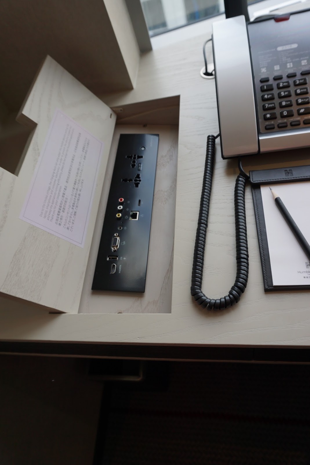 | Multimedia plugs that connect to the TV and a couple of international power outlets can be found on the work desk |
