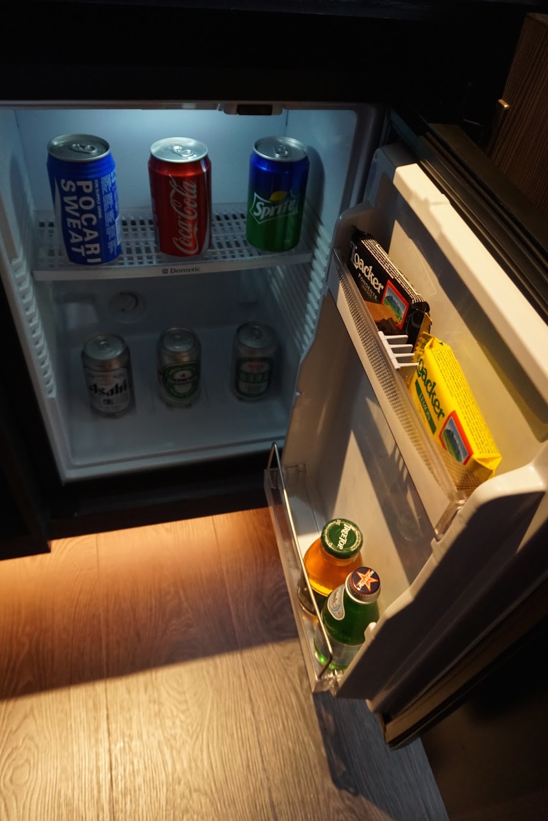 | A small fridge is well tucked into one of the cabinets in the minibar area. All contents inside this fridge are chargeable |