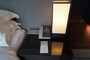 | Control panel for lightings and the blinds is located on one of the bedside tables, together with one of three phones in the room |