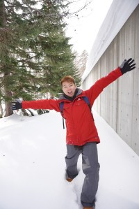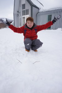 My friend posing with the snowman he built (can’t really see from this picture, but there is a small snowman there)