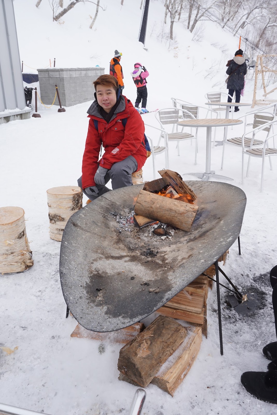 There is a fireplace in front of Tenbou cafe where visitors can sit around