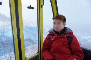 My friend in the gondola on our way up to the top of Mt Tomamu where Unkai Terrace is located