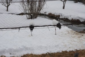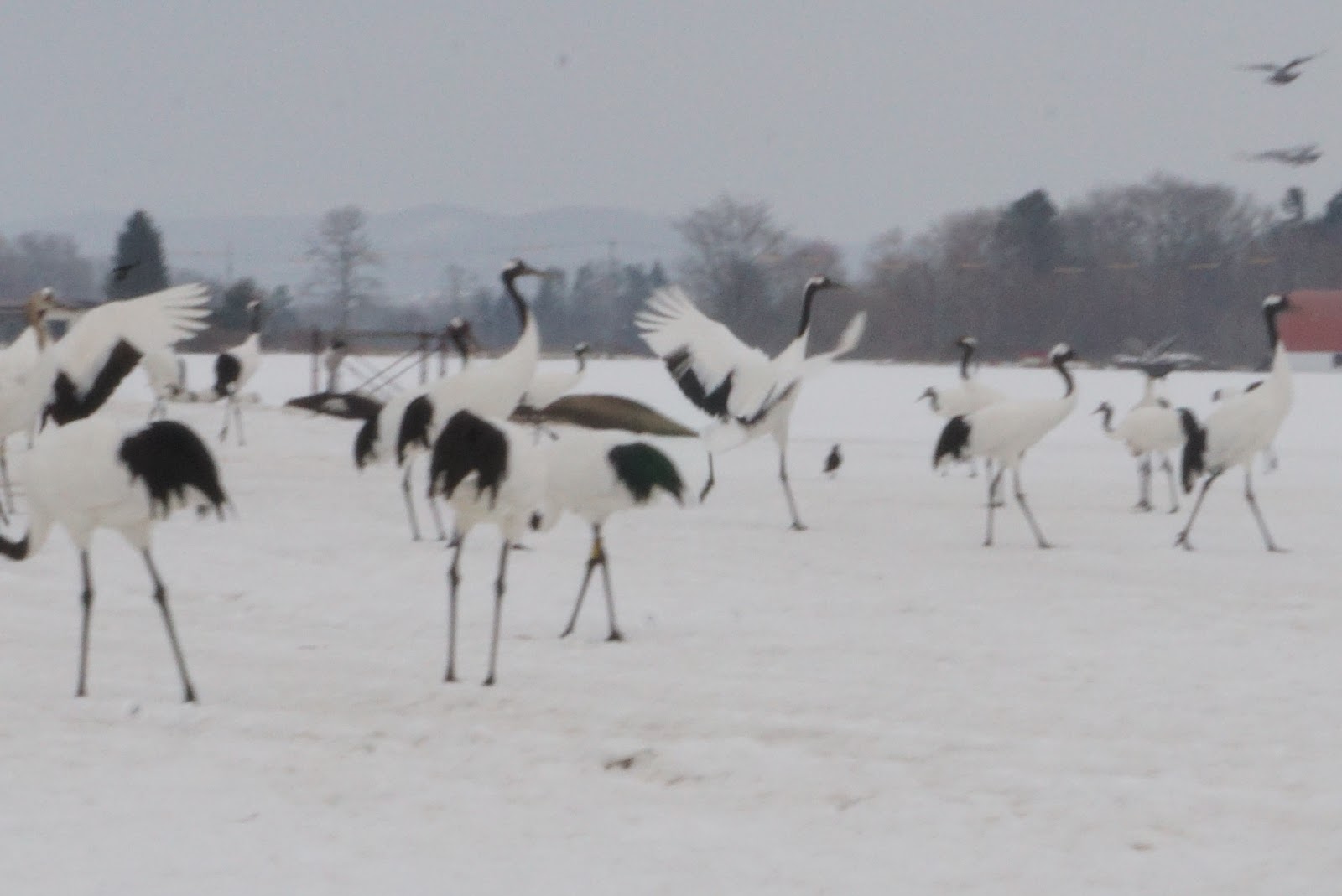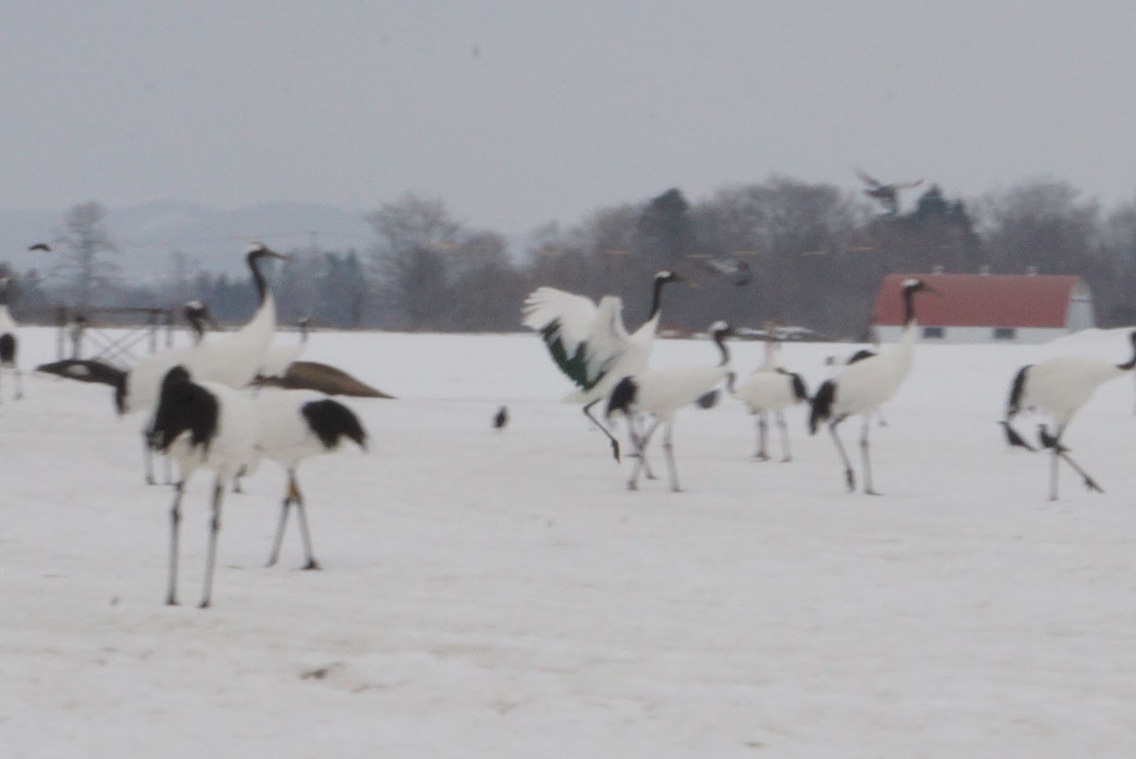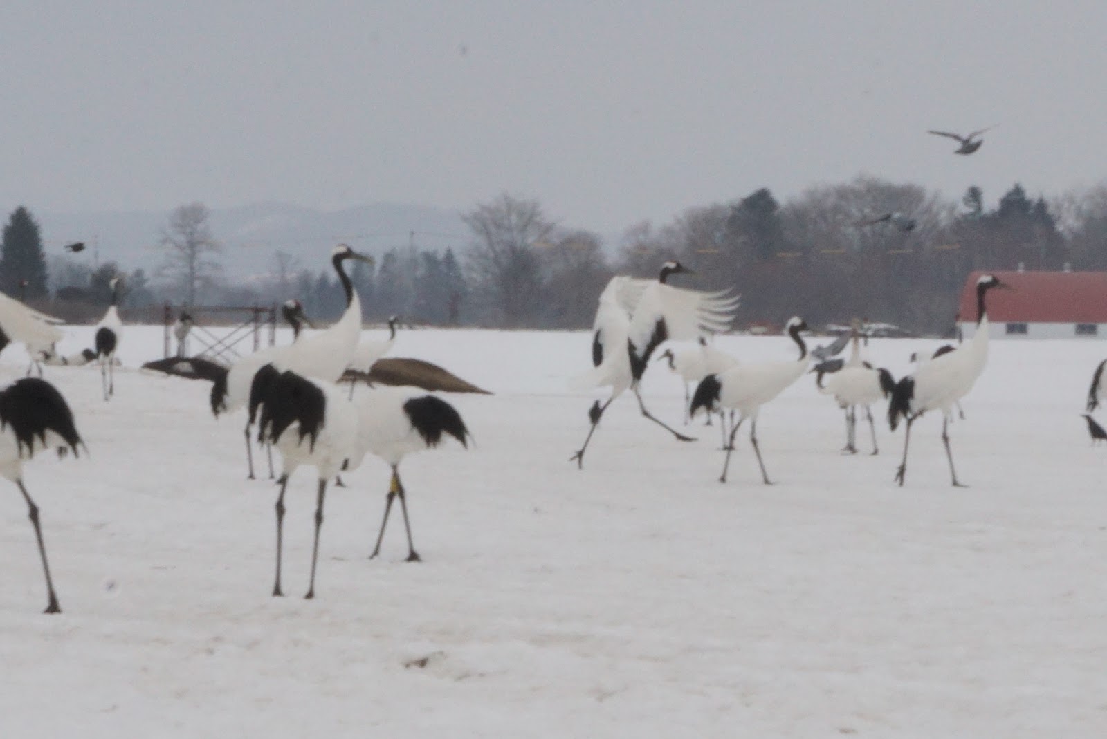 | Most of the time we were there, these cranes were seen looking for food in the snow |