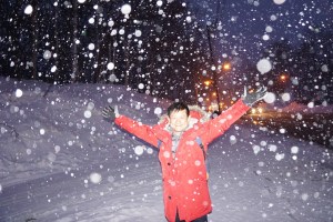 | Me with the Tancho Cranes in the background. They seem well hidden with the snowy landscape |