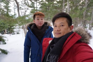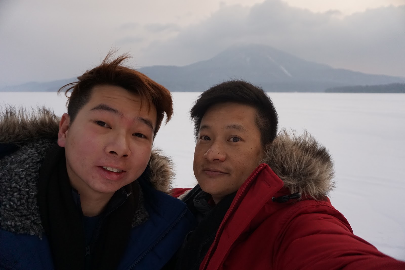 | My friend and I taking a wefie with Mt Oakan on the frozen Lake Akan |