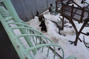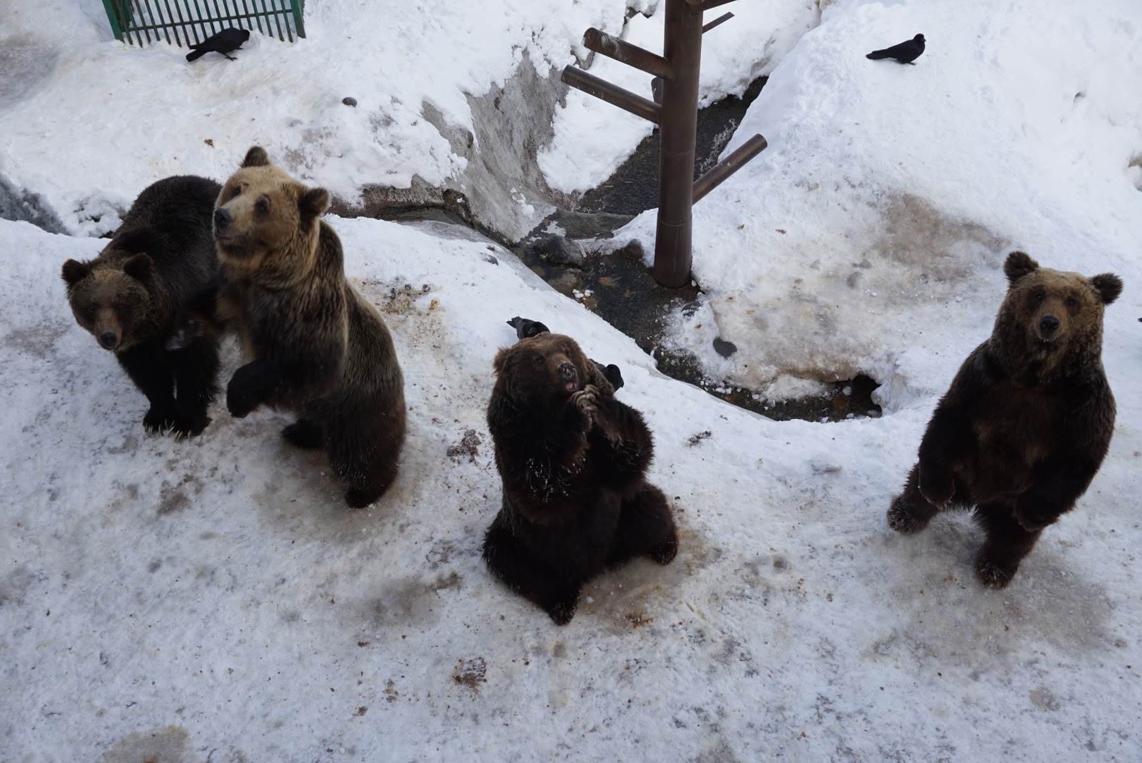 There are 2 bear farms on the left from the exit of the gondola station. We headed for the first bear farm, which houses male bears. There is a tunnel that says “Human Cage” beside the stairs that leads to the open observatory for this farm. After buying a packet of biscuits, my friend and I entered the “Human Cage”. This is where we can face to face with the Hokkaido Brown Bear, which is worshipped by the local Ainu people as a god. The only thing that separates us from the bear is a panel of glass. There is a metal rod that allowed my friend to push a piece of biscuit through to feed the bears. As the bears seem inactive, we wanted to head to the open area to feed the brown bears from the top. However as we exited the “Human Cage” tunnel, we saw a flock of crows at the railings and decided to head for the second farm.