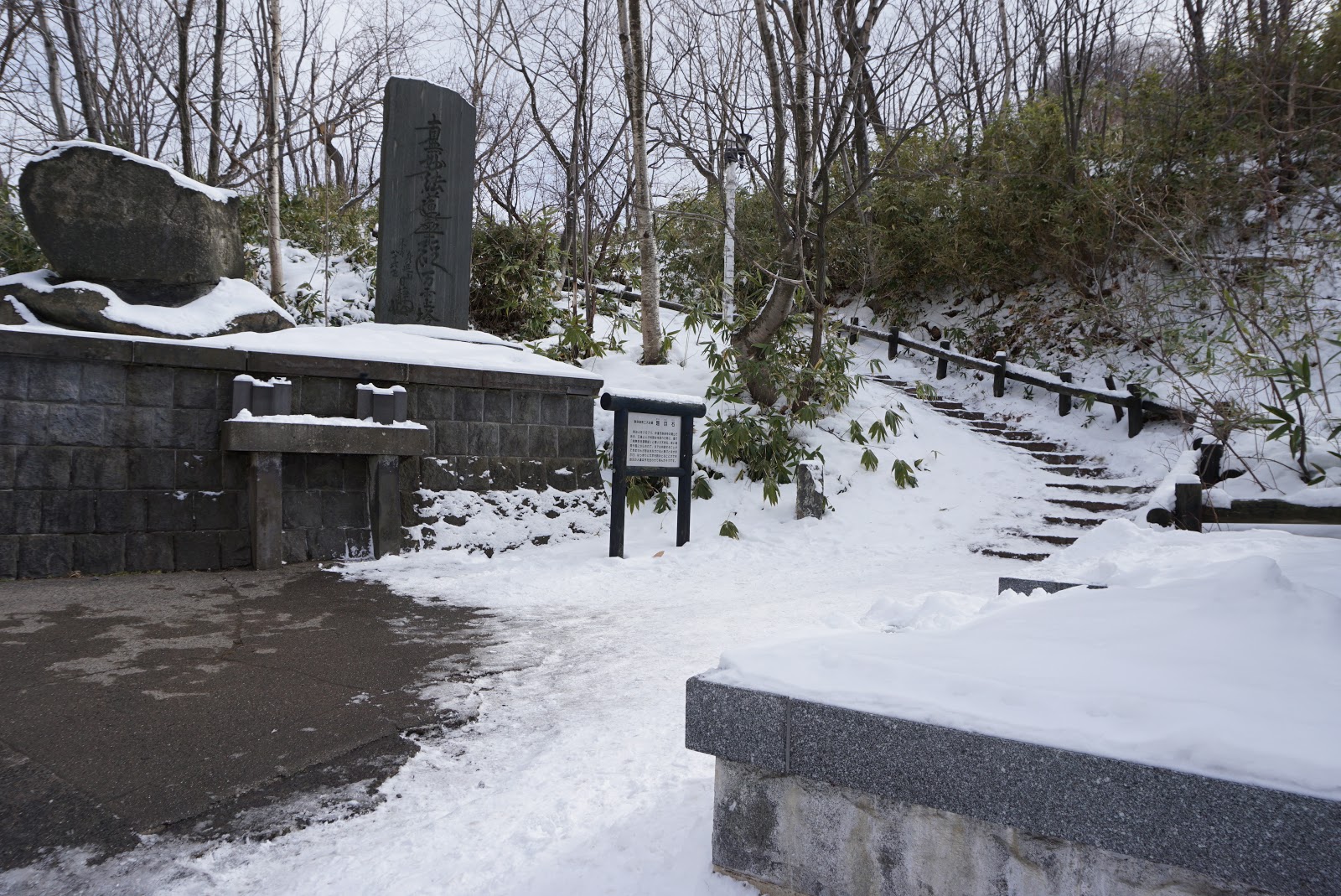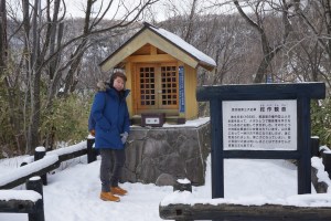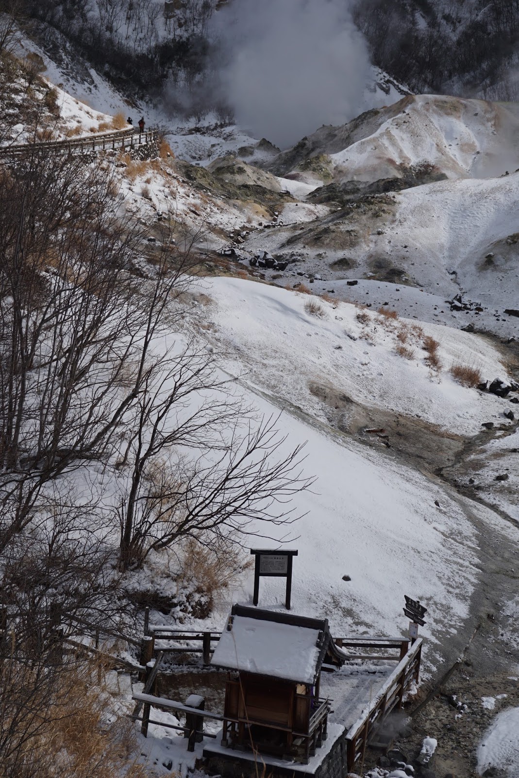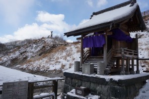 We headed for Jigokudani immediately after breakfast, wanted to see the famed Hell Valley as we missed out on it due to the heavier than we thought snowstorm the night before. It is a good thing to visit it early before busloads of tour groups arrive, making taking pictures tough. There are several paths to take at Jigokudani. Only Jigokudani was opened during winter (the other paths are Oyunuma Pathway No.1 and No.2, Funamiyama Pathway No.1 and No.2). The Jigokudani Pathway is about 570m and would take 10 mins to complete (without all the stops for photo). Jigokudani Pathway took us down to the valley floor where the source of a crater formed by an explosion some 20,000 years ago being the U-turn point. There are 2 ways one can take on the Jigokudani Pathway, my friend and I took the path that brought us to the down to the valley and turned back to continue the path that took us to a viewpoint that overlooks at the Hell Valley. We were walking carefully down to the valley floor as the ground was covered with ice, we came across a small shrine, a short detour from the path.