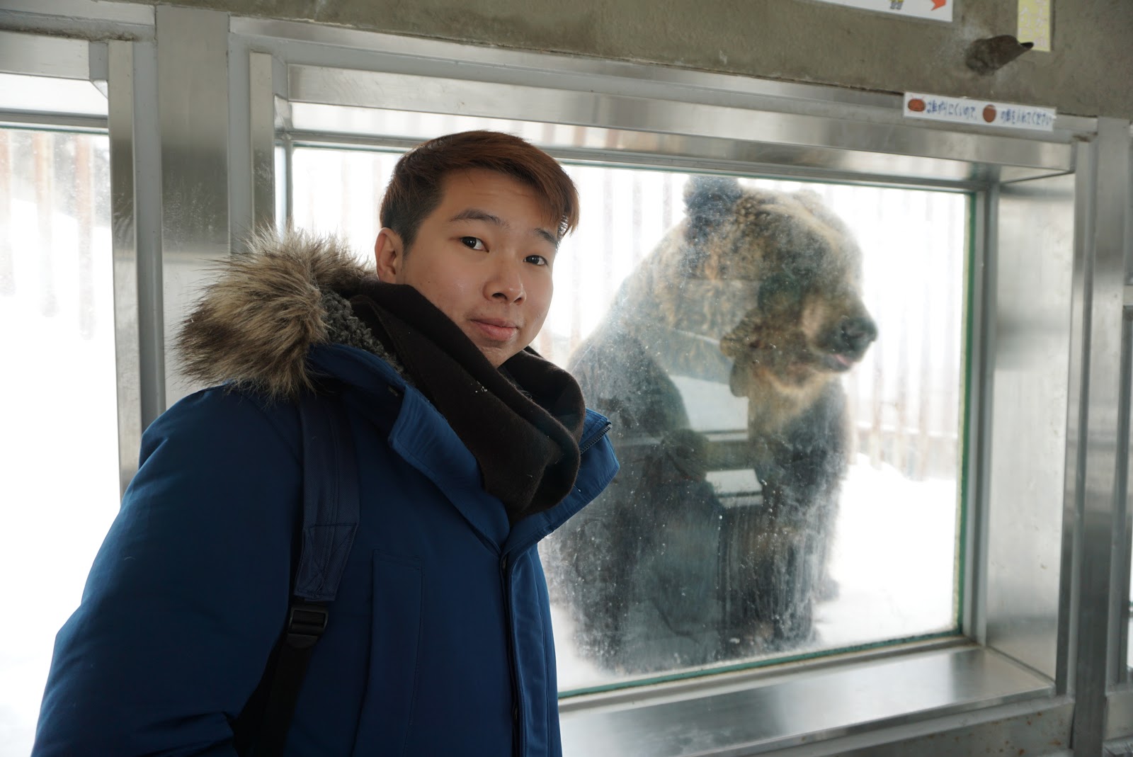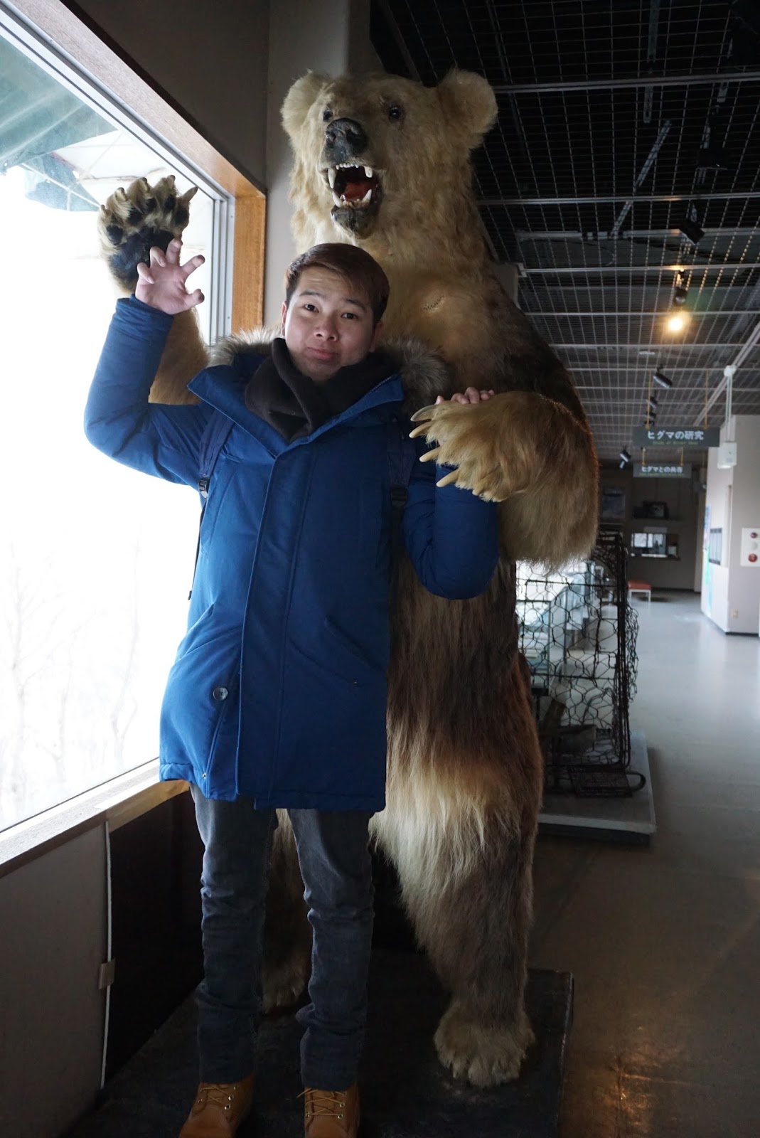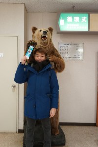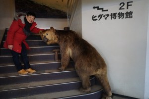 | Me with a brown bear in the Bear Museum in Noboribetsu Bear Park |