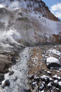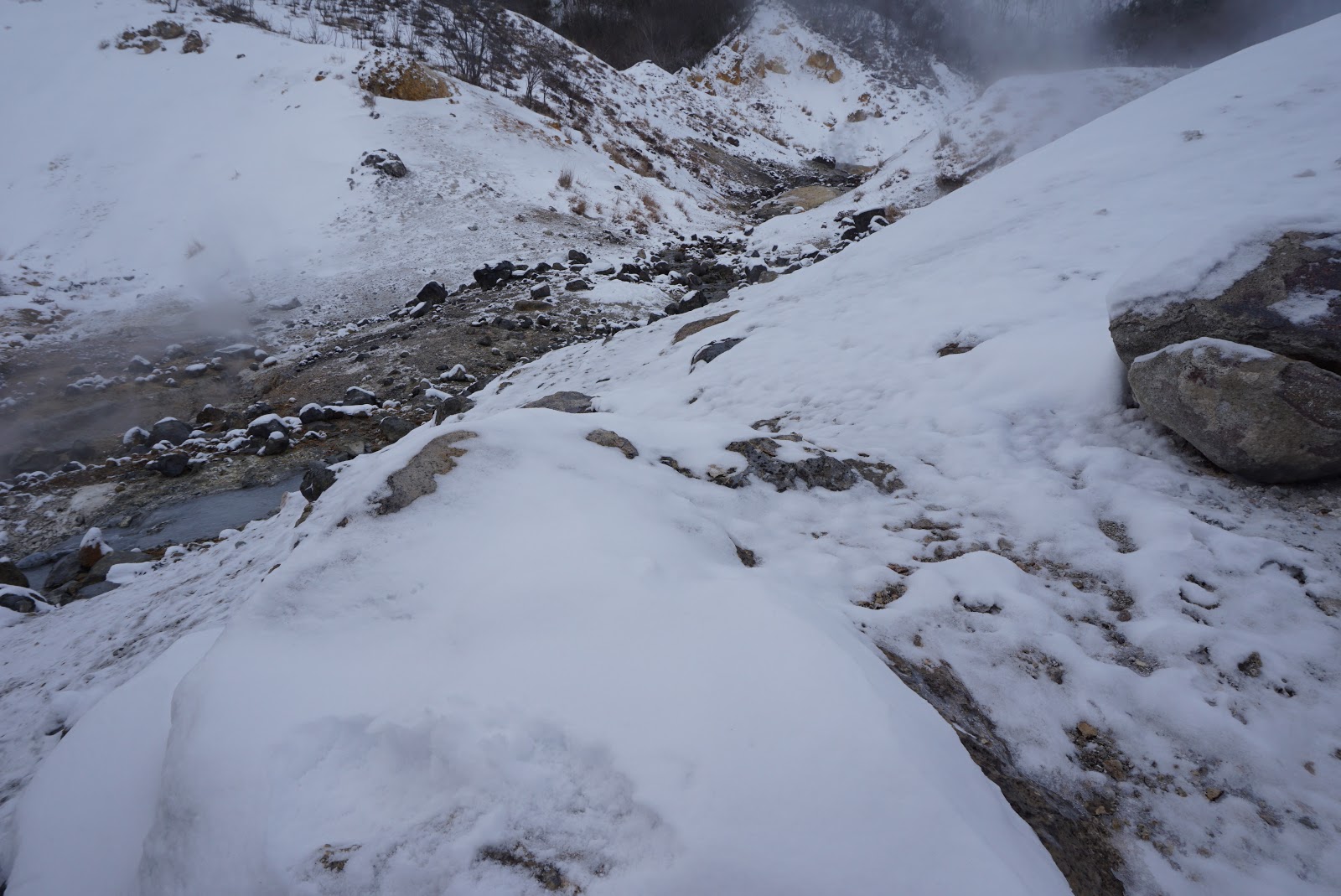 | A hot stream on the valley floor of Jigokudani |