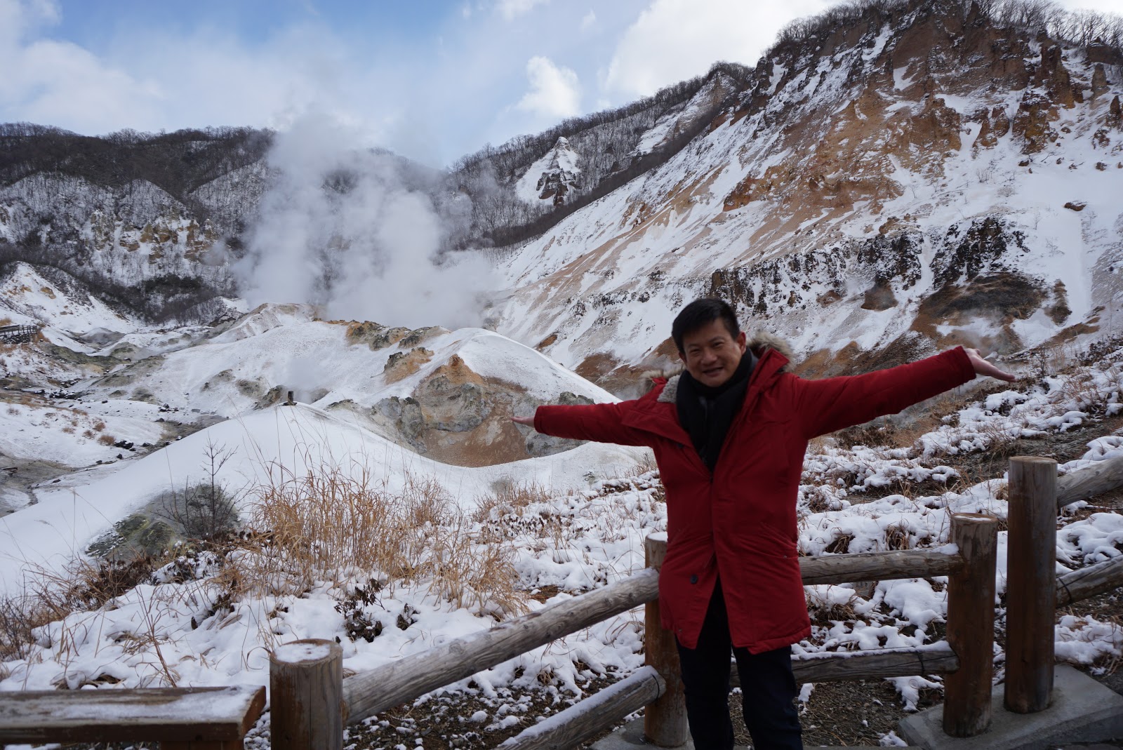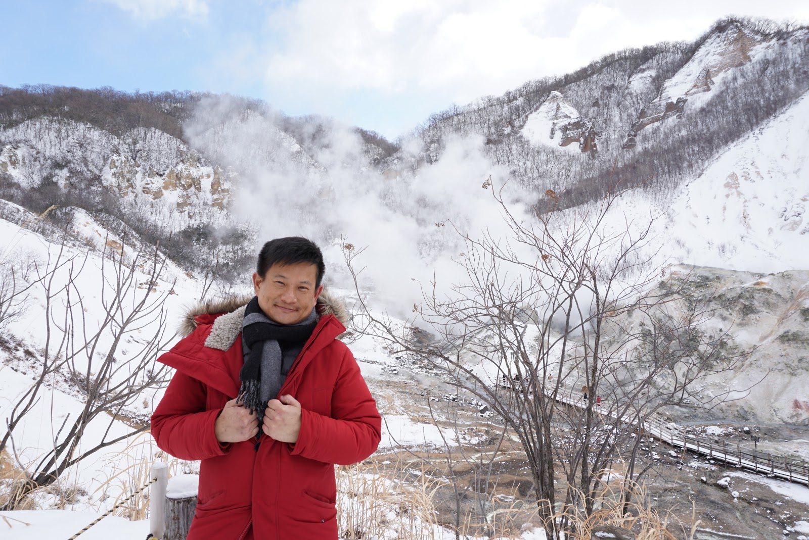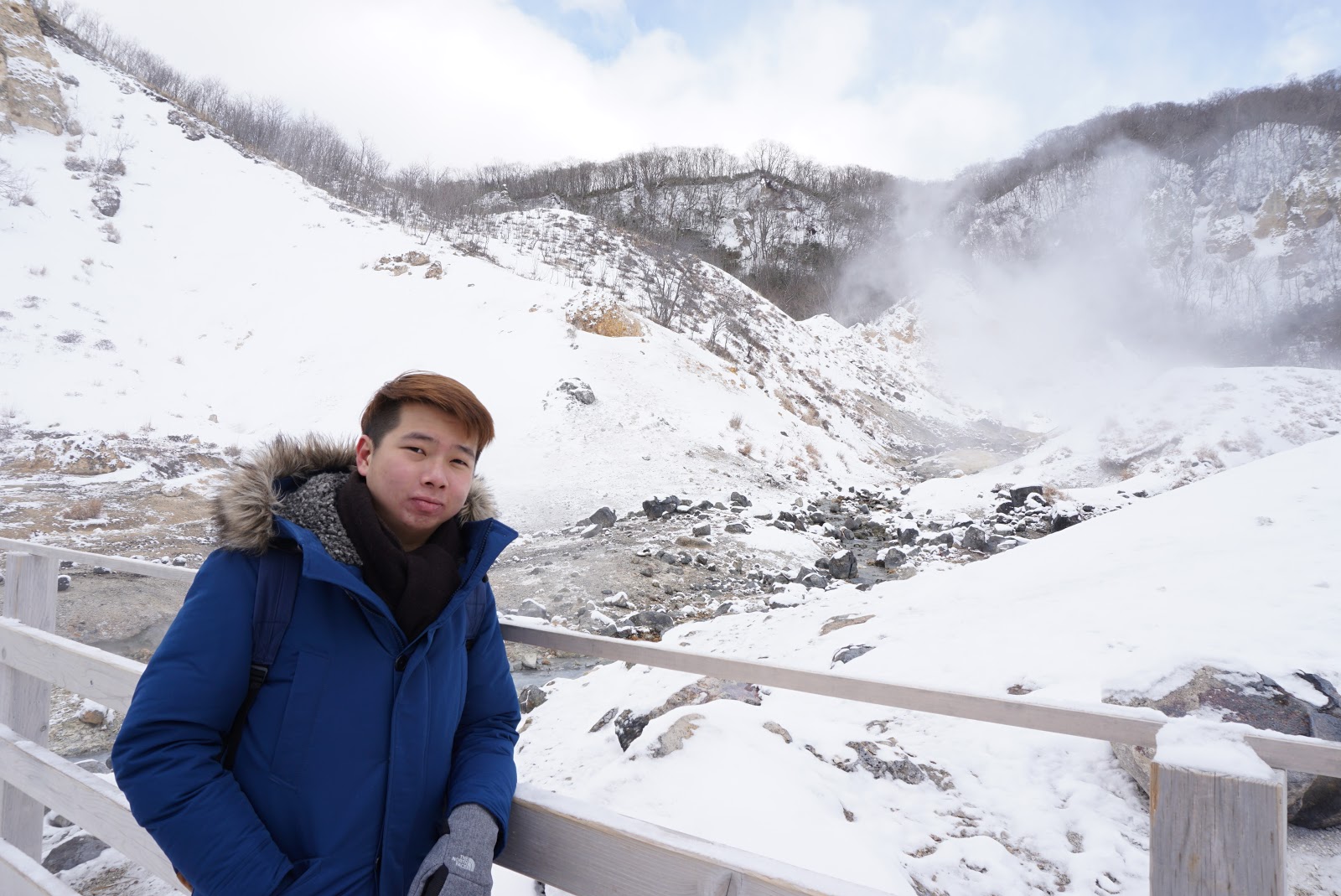 As we were walking along the pathway, a stretch of wooden walking, extending from the path into the valley floor. Walking down at the Jigokudani valley floor feels like walking in another planet, a valley with no form of life and steams sprouting out occasionally from holes on the ground and puddles of boiling greyish water scattering all over the ground. The mountains around us are bare with earth brown and red, covered with a thin sheet of snow at parts of the mountain. Temperatures of water here can reach as high as 88℃. At the end of the wooden walkway at the valley floor is a loop surrounding Tessen-Ike, a geyser with greywater, boiling by the forces of nature. As I look up behind the mountain that is nearest to us, steams constantly racing to the sky creating a think white blanket. The view here is more spectacular rather than dangerous as we were well protected by the railings on the walkway. As more tourists arrive, my friend and I headed back to the detour point and got back on track. The path snakes up the hill, although this area of the path is covered in thick snow, the stairs that lead us up the hill is still apparent. Threading carefully upwards, the steam from the valley floor was still gashing out from the ground, the scenery is breathtaking.