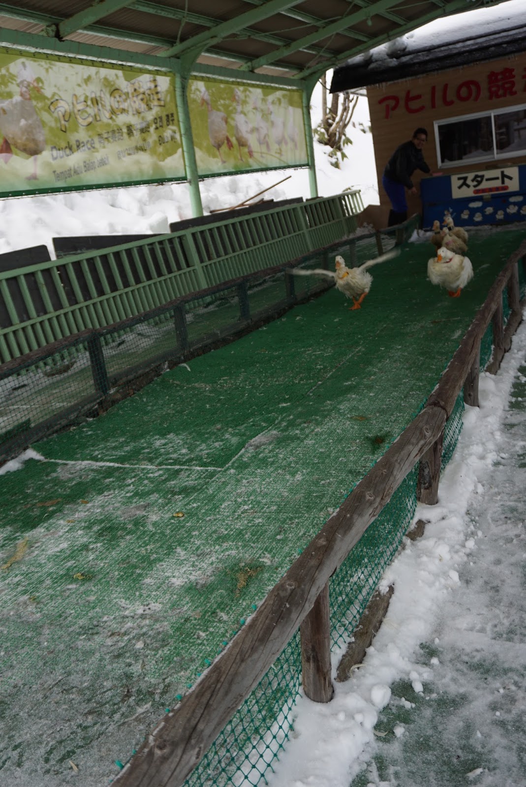 The gondola ride up to Noboribetsu Bear Park is an attraction itself. As the gondola ascends up to the summit of Bear Mountain, the entire Noboribetsu Onsen slowly comes into sight. The more the gondola ascends towards the summit station, the more of the surroundings can be seen. Near the summit station, I can see the mountain ranges that seem to protect Noboribetsu Onsen and the road leading to Noboribetsu Onsen. Arriving at the summit station, the first thing that caught my attention is the shed that houses a small race track. At the time of our visit, there is a duck race on-going, where visitors can bet on. Winners will get a souvenir from the bear park.