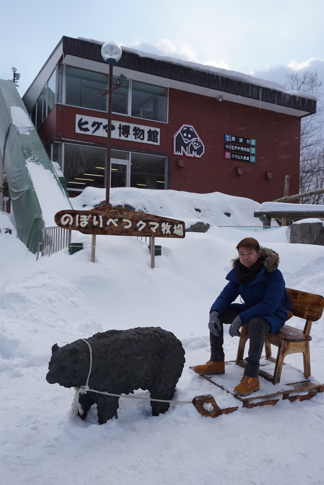 It is already past noon by the time we reached the entrance to Jigokudani. We headed back to the hotel to grab battery for my camera, which went flat due to the cold weather. We did not originally plan to visit the Noboribetsu Bear Park, however, we couldn’t resist the call to visit the Bear Park walking past it a few times when we were strolling along the main street of Gokuraku Shopping Street of Noboribetsu Onsen. Noboribetsu Bear Park entrance is sitting on top of a hill next to the Gokuraku Shopping Street, one can’t miss the pink colour building overlooking Noboribetsu Onsen. To get to Noboribetsu Bear Park, we walked along a street located in the middle of Gokuraku Shopping Street, opposite the only 7-Eleven in Noboribetsu Onsen, that led us up the pink building sitting on top of the hill. This is the entrance and the gateway to Noboribetsu Bear Park. We got our tickets in this building and took a gondola up Shihorei, or Bear Mountain according to the locals. The bear park itself is sitting on top of a mountain, some 550m tall.