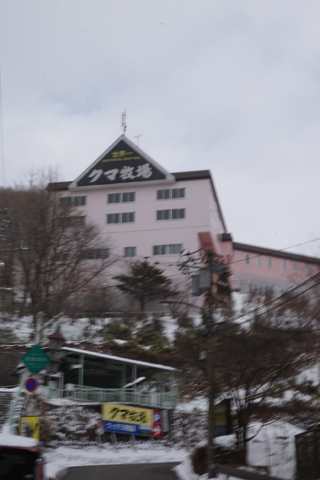 | The pink building is the ropeway station and ticketing counter for accessing Noboribetsu Bear Park |