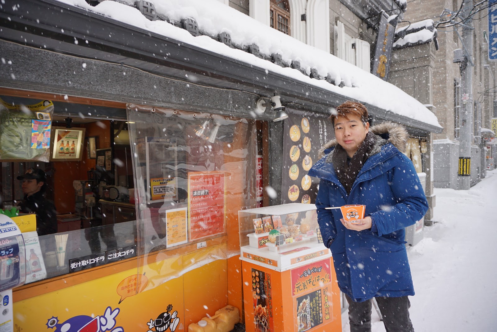 It started to snow as we were getting some street food in Denuki-Koji Street