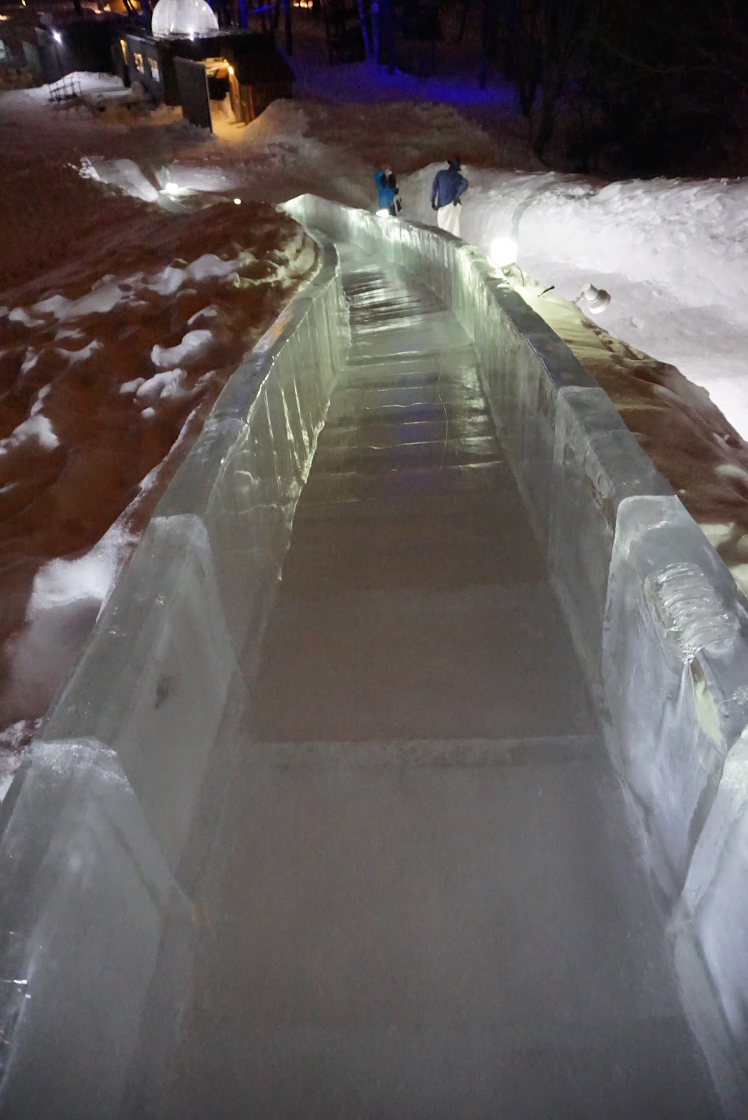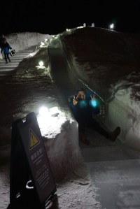 Within the resort grounds lies the Ice Village, which is only open during winter months. After dinner, we headed for the Ice Village. Instead of catching the shuttle bus, we made our way to the Ice Village by foot through the covered walkway that linked the different hotels within the resort. The walk to the Ice Village from our hotel took around 10 mins. The entrance to the Ice Village was marked by an archway made entirely out of ice. From the archway, a one-way path took us to cross a small wooden bridge and up a small slope. The village is nowhere in sight as we were walking in the snowy path up the slope. At the top of the slope, there it is. The ice village bathed in colourful lights is perched at the bottom of the slope. We were excited when we saw the ice village. As we were making our way down the slope, we came across an ice slide. It was not well marked and can be easily missed under the cloak of the night. We took the option of sliding down the ice slide instead of walking down the ice steps. The slipperiness of the slide as a result of the ice zoomed us down the slide fairly quickly. It was fun!