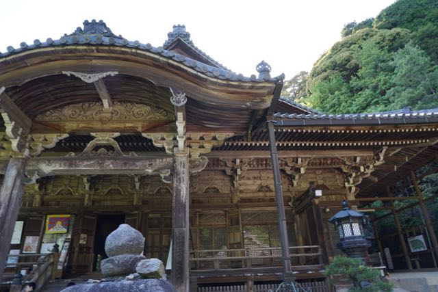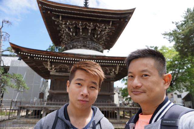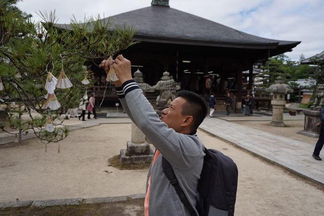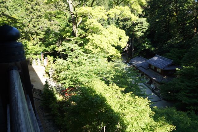 Another 5 mins walk later we arrived at one of the ancient Temples in Engyoji. The Maniden was first built in A.D970, dedicated to the Goddess of Mercy. However, Maniden was burnt down in 1921, the present building was completed in 1932 and stood strong since then. The entire building is made of wood, on top of a hilly part of Mt Shosha. A staircase leads to the entrance of Maniden. From the bottom of the staircase, I can see part of Maniden is being built into the soil of the hill, and part of the temple protrudes out into the air, supported by numerous thick pillars which looks as though it has been there for ages. Once at the top of the staircase, Maniden comes into full view. The entire Maniden is made of wood that seems to stand the test of time. I did not see any nails or any metallic pieces that were used in the construction of this magnificent temple building. Despite not clad in bright colours and still reminding in its wooden finish colour, Maniden still looks magnificent owing to the intricate carvings on the front of the temple. Maniden has a balcony-like structure outside the prayer halls, handing over the cliff side of the hill it is built on. After my friend and I paid respects to the Goddess of Mercy installed in Maniden, we wandered around the parameters of Maniden on the balcony. Perhaps due to the low in human traffic, looking out into the greenery spring forest of Mt Shosha gives me a sense of tranquillity. As Maniden was not too big, we continued the pathway and headed towards the next group of 3 temple buildings.