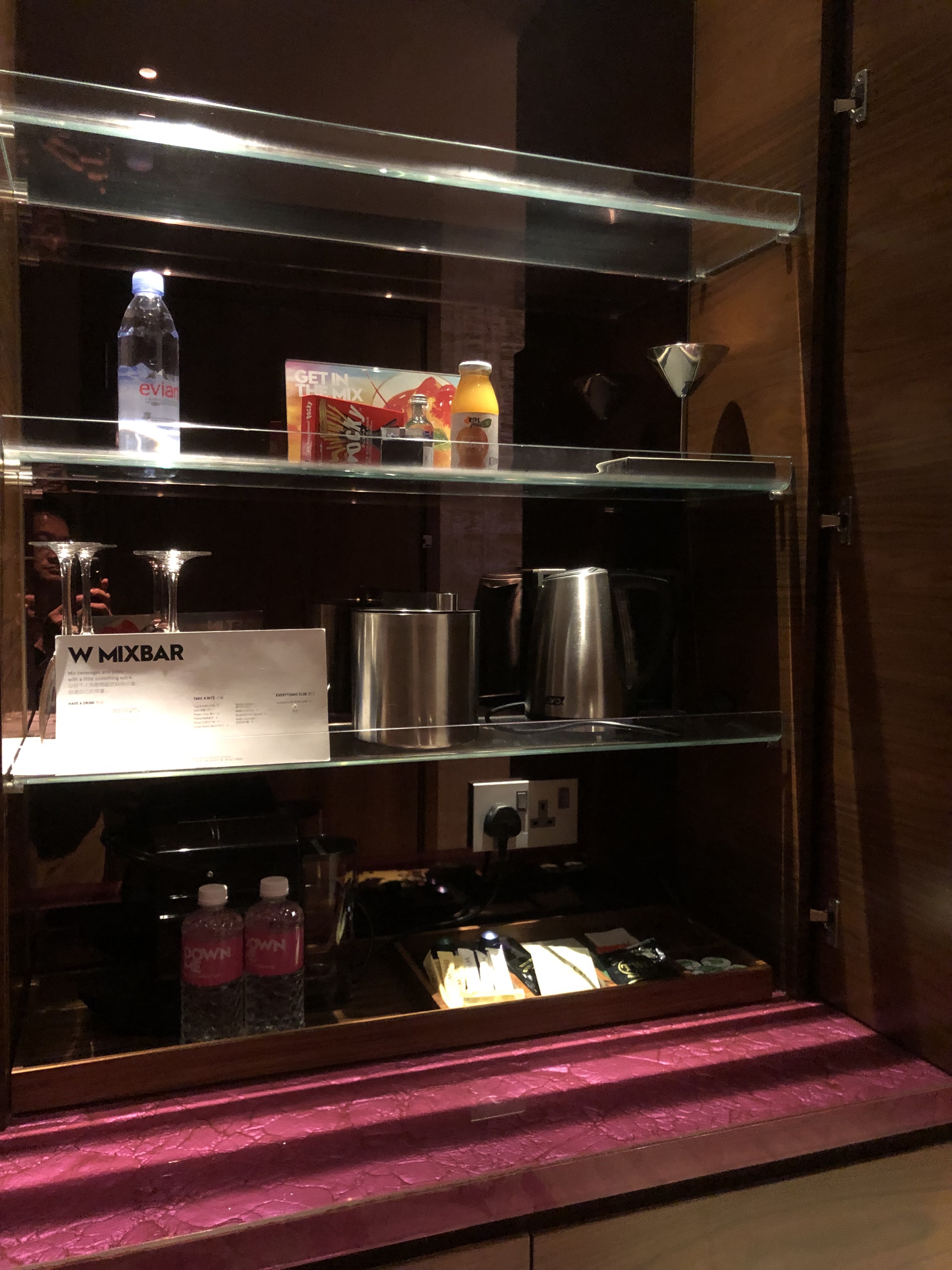 Opening the main door to the Marvellous Suite in W Hotel Sentosa Cove, a short walkway leads guests into the living room. On the right of the walkway in the Marvellous Suite is where the mini bar area is located. The mini bar is designed to conceal inside the cabinets. Opening the panels, the top shelf is where one finds a Nespresso Machine, electric kettle and some snacks. Below the shelf is a cabinet where a small fridge is hidden. All mini bar items less the coffee and tea are chargeable. W Hotel Sentosa provides sufficient bottled water, thoughtfully placed throughout the suite for guests to hydrate.
