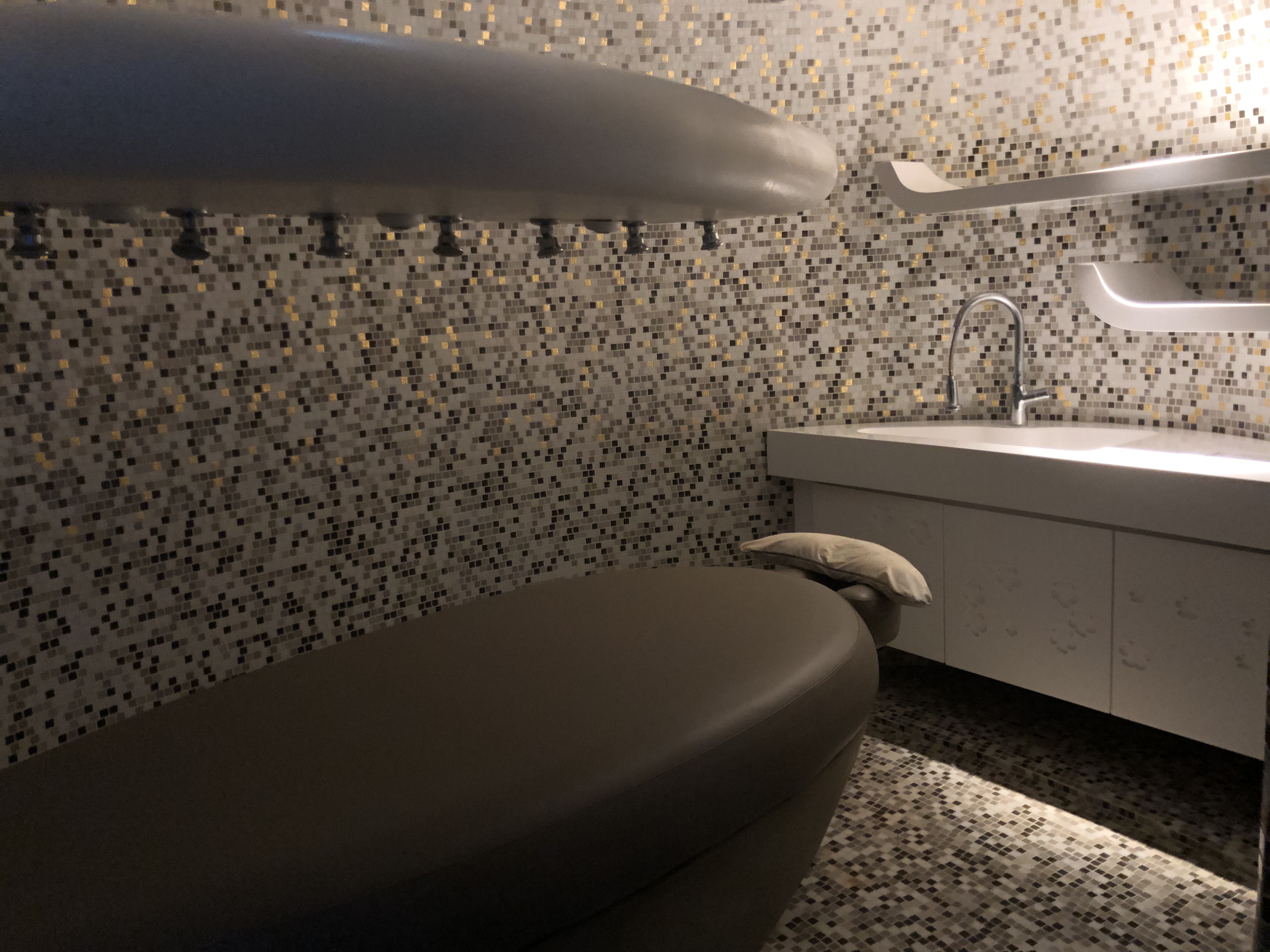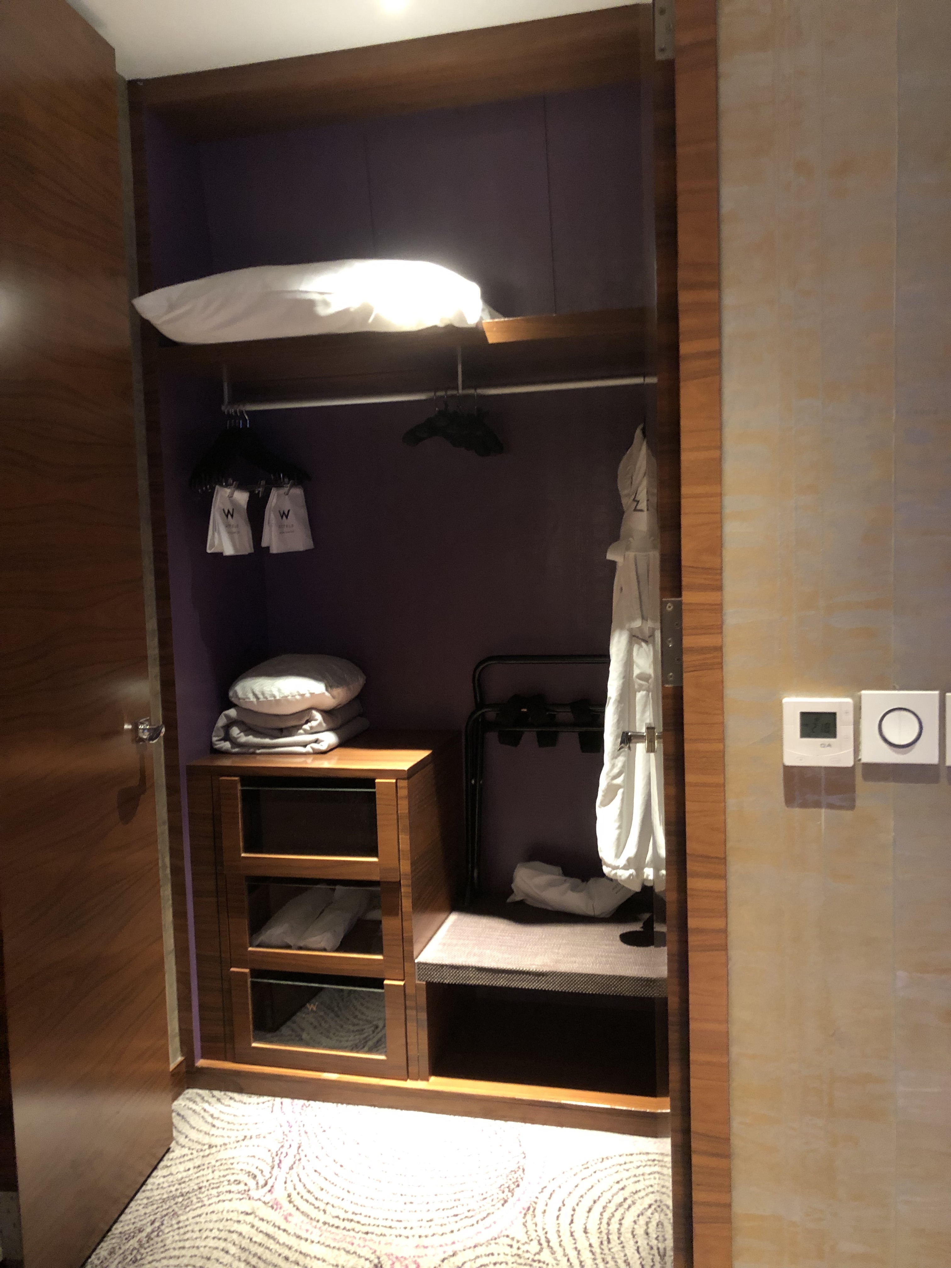 The entrance into the bedroom is located between the TV and the work desk. The bedroom is decked out in floor to ceiling glass panels, when the curtains are opened, provides views of the marina as well as the WET Pool. The moment I entered the bedroom, an egg-shaped hanging chair in the room caught my attention. This chair is comfortable to sit in and the placement of this chair is not obstructive in the bedroom. There is a small walk-in wardrobe located behind the door to the entrance to the bedroom. The space in the wardrobe is generous for guests to hang out their clothing, coupled with a three-tiered drawer, of which only two are usable, providing guests with ample space to store their clothing. The in-room safe is found in the top drawer, keeping valuables of guests safe while they are out of the hotel. Inside the walk-in wardrobe is where a cloth steamer (first time I saw one in a hotel) as well as iron and ironing board.