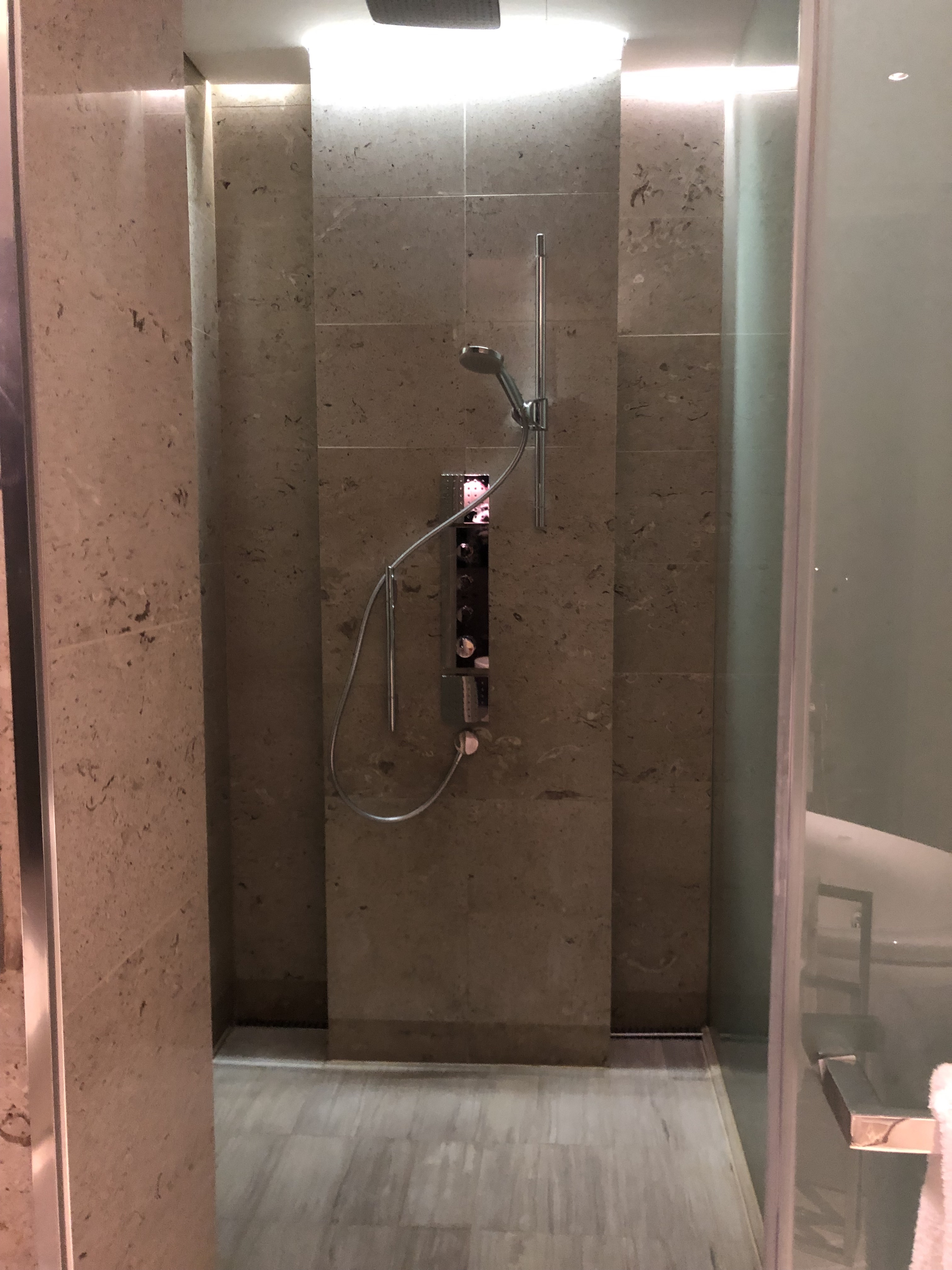 Next to the sink and behind the bathtub are two cubicles, sharing one glass panelled sliding door. On the left is the shower cubicle which not only has the standard rainshower head and a regular shower head, it is also equipped with a body shower head, which is rare in hotels. The shower cubicle is very spacious as well with ledges hidden behind the shower where guests can place their toiletries. The cubicle to the right is where the toilet is found in the bathroom.