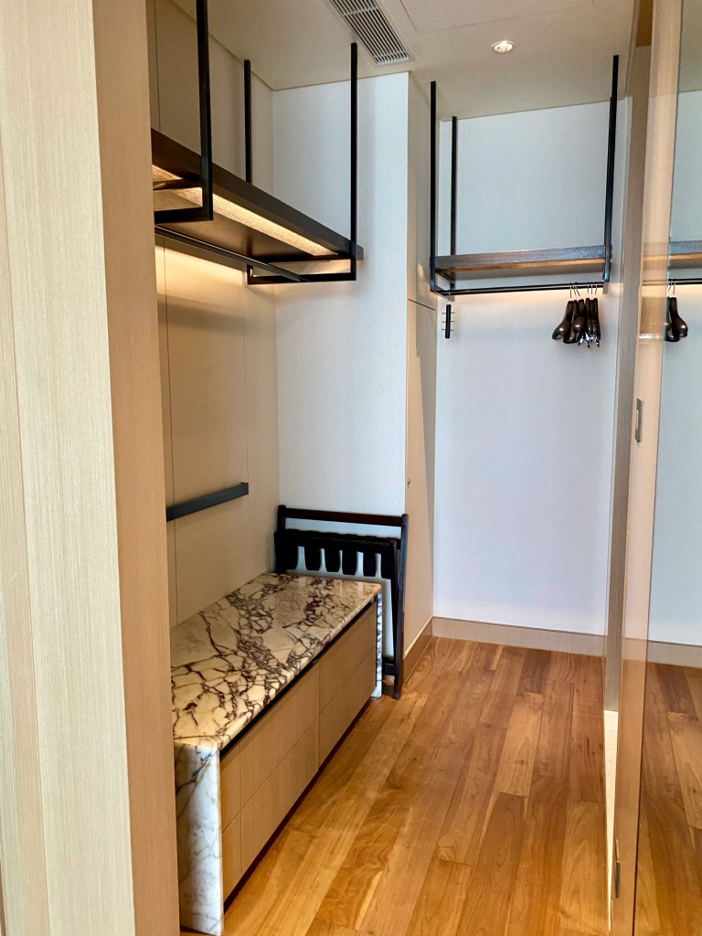 Instead of using a traditional closet, Sofitel Singapore City Centre employs an open closet concept in the bedroom. The open closet space gives the decor a chic feel and does not make the bedroom feel cluttered. The open closet is well placed in front of the entrance to the bathroom, providing convenience for residents in the Prestige Suite. The in-room safe is found hidden in one of the two big drawers in the closet space. The marble-topped drawer cabinet provides additional space for residents of the suite to place small items or to stow their luggage.