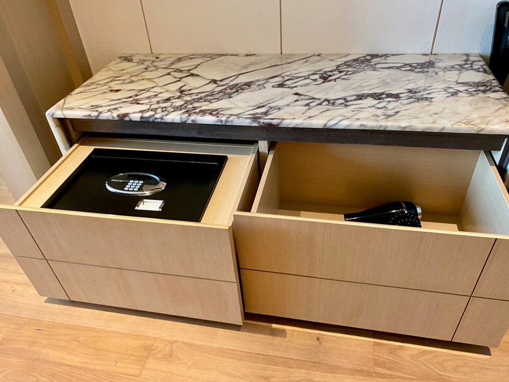 There are two large drawers in the open closet area, one of which houses the in-suite safe