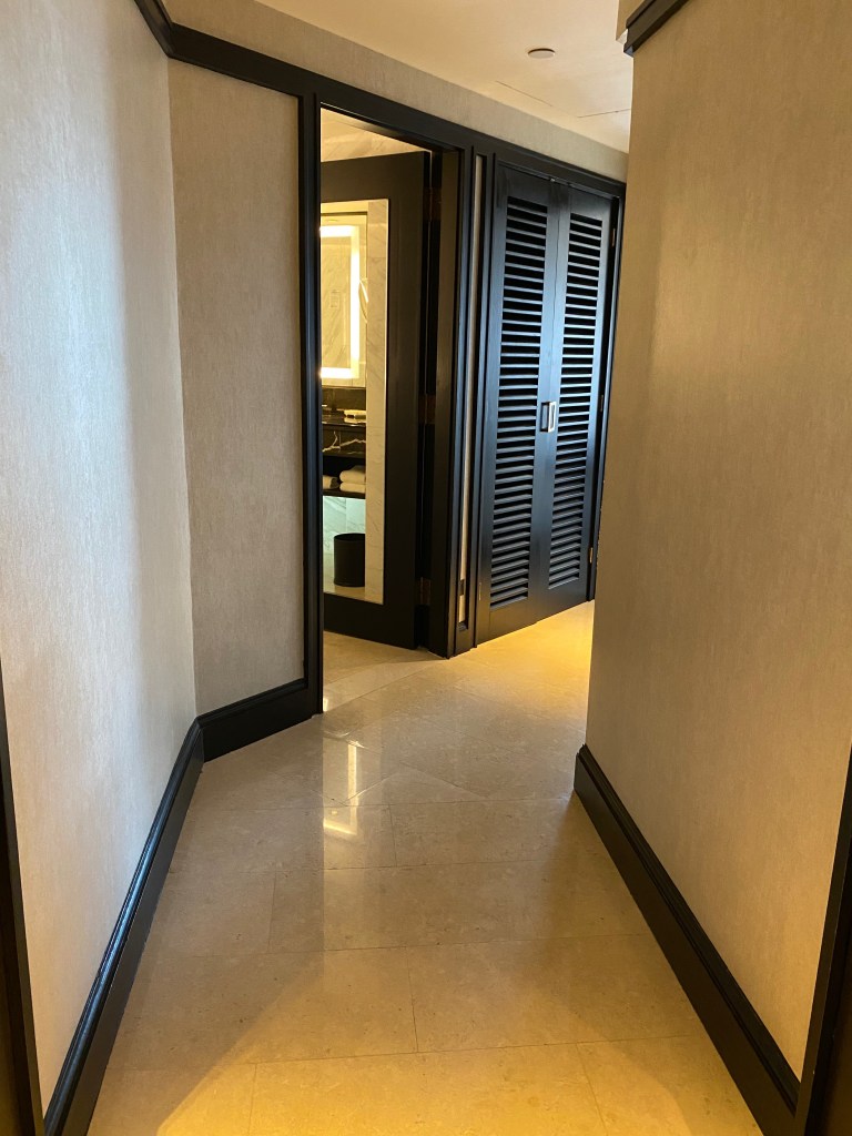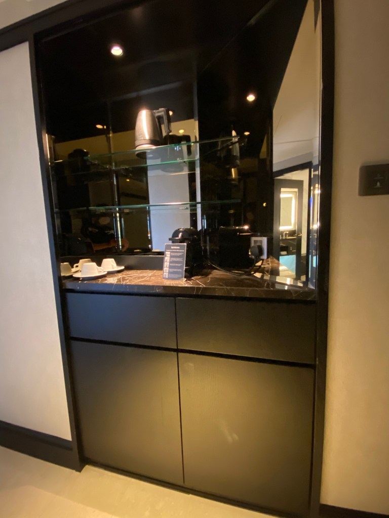 The entryway in Fairmont Singapore’s Signature King Suite extends from the entrance to the central part of the suite. I like the way Fairmont Singapore maximises the utility of this part of the suite. Other than serving as a walkway into the suite, the hotel fitted a couple of cabinets next to the suite’s entrance. One of these cabinets functions as the minibar. A Nespresso coffee machine, kettles, tea bags and mini-fridge is located in the suite. The other cabinet provides additional storage space where I put the snacks we brought for this staycation. Unlike the Signature King Salon Suite’s entryway, which is decorated with artworks, the entryway in Signature King Suite feels plain and empty. I also thought the zigzag entryway in the Signature King Suite has the additional function of providing its guests with some degree of privacy as people outside the suite cannot see directly into the suite. The bathroom and wardrobe of the Signature King Suite are located along the entryway corridor.