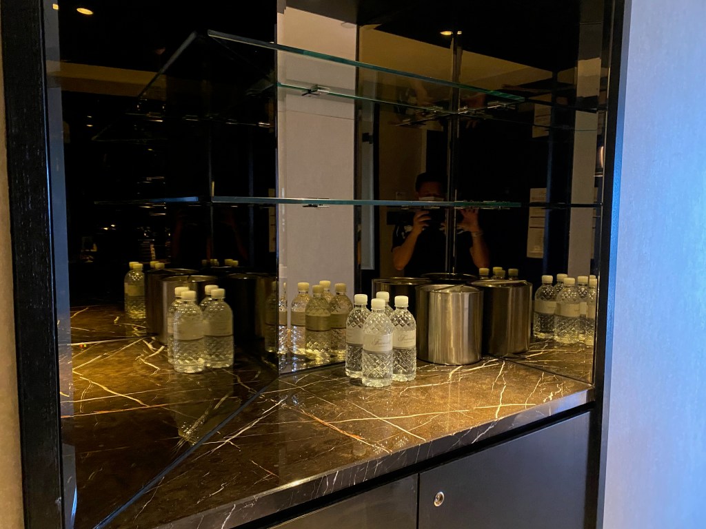 Bottled water is placed by the hotel on the cabinets opposite the minibar.
