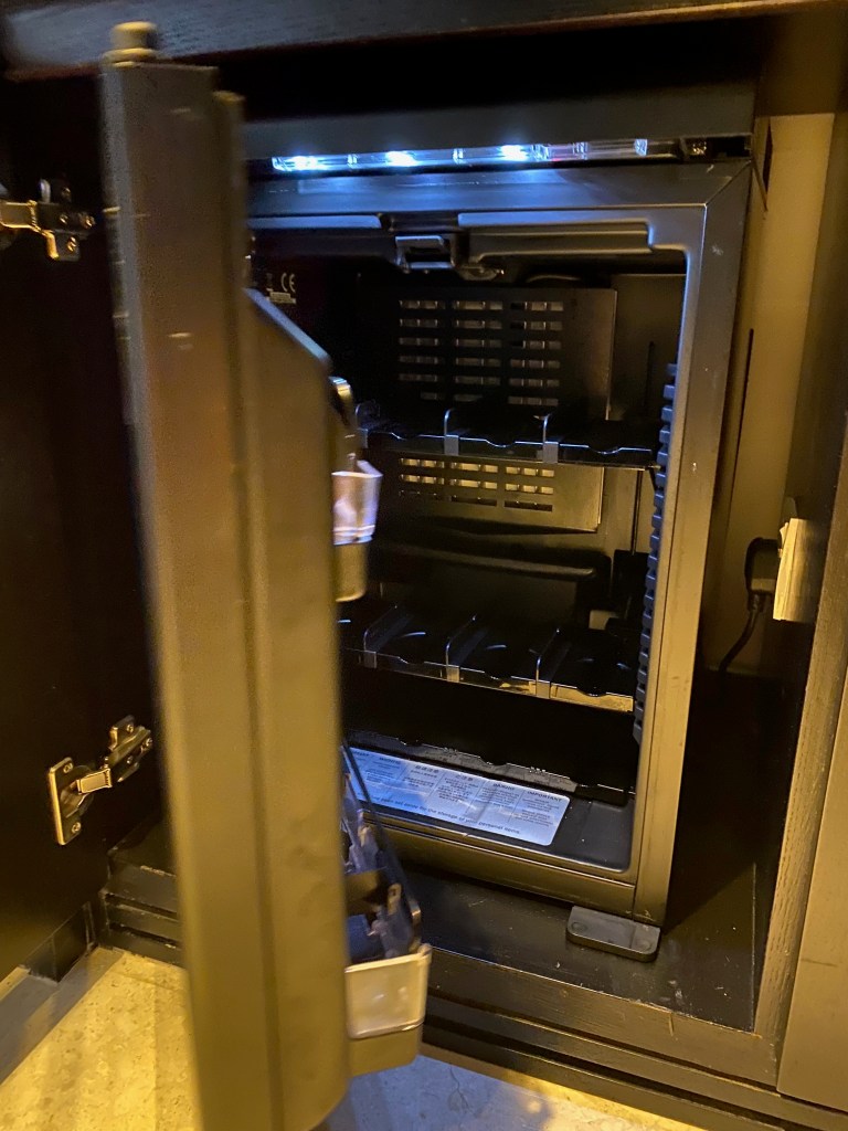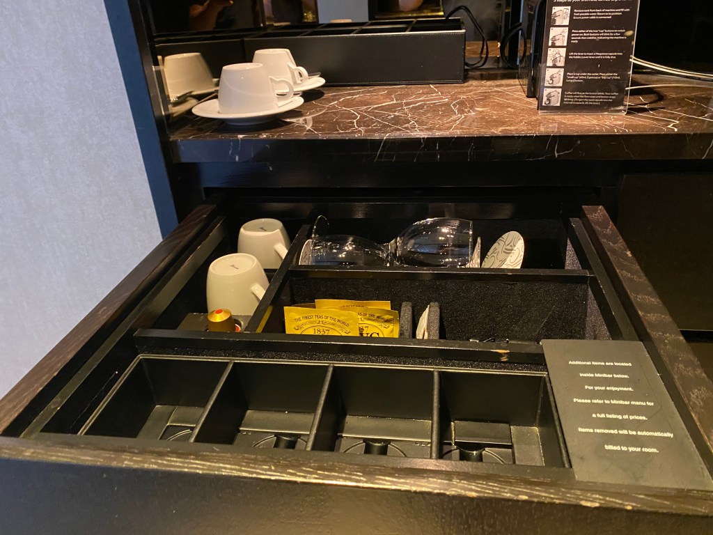 Cups and complimentary coffee and tea are found in the drawer in the minibar area.