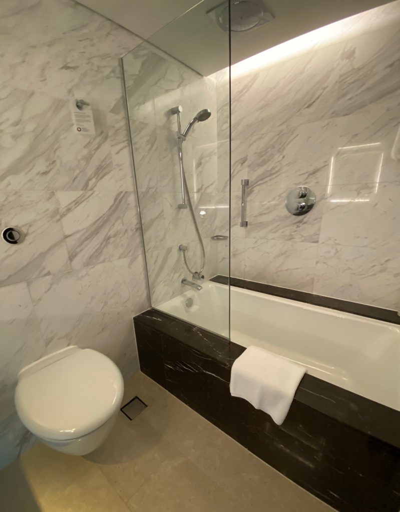The bathroom in the Signature King Suite is clad in white and black marble, giving it a luxurious feel. Although the bathroom in the suite is on the small side compared to the Junior Suites in some other hotels, it seems like the hotel devotes more space to other parts of the suite. The bright tiles and lighting, coupled with the large mirror that extends to the entire wall space by the sink, makes the bathroom feel spacious. The bathroom in the Signature King Suite is equipped with one sink. However, I appreciate the additional space at the sink countertop where I brought the toiletries.