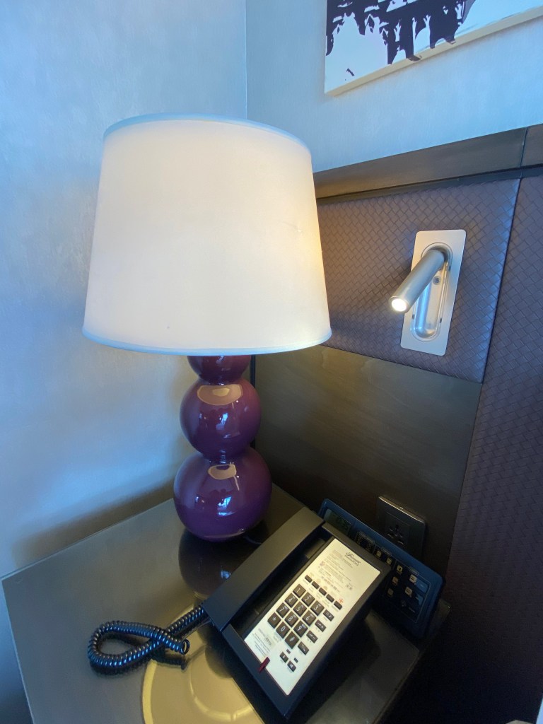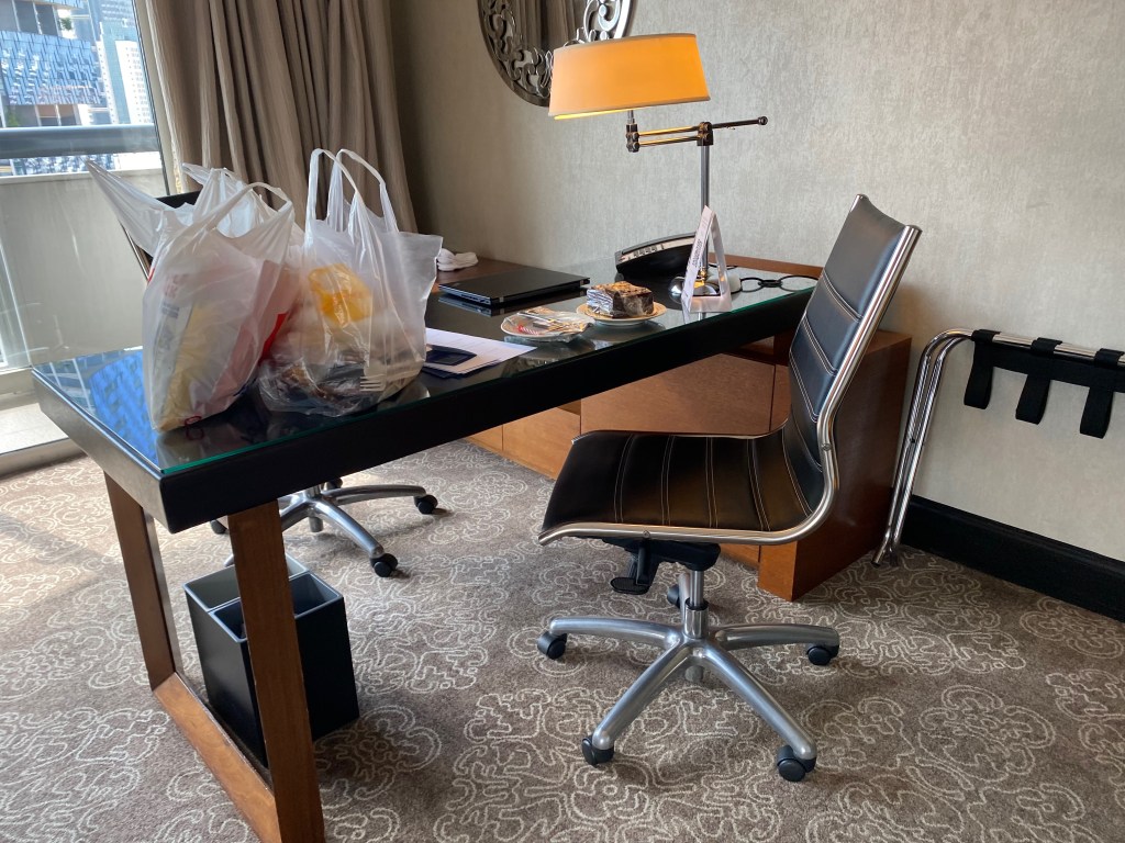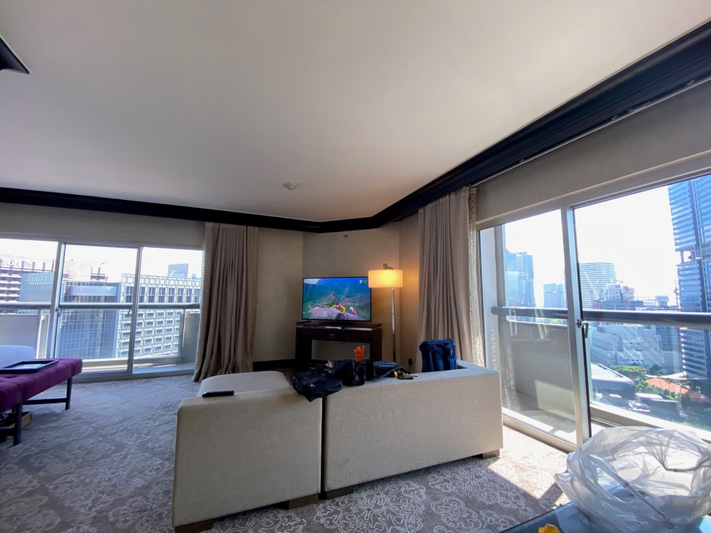 The end of the corridor from the entryway opens up to the spacious L-shape layout suite. At the end of the “tunnel” from the main entrance sits a reasonably large work desk. Besides using it to work, which has sufficient space to put our laptop and some working files onto, we also use the work desk as a dining table. Unlike the Signature King Salon Suite, the work desk in the Signature King Suite is furnished with two chairs. I like the power outlet placement next to the work desk, making it convenient to charge our laptops. However, despite having an HDMI socket next to the power outlet here, we did have problems connecting our laptop to project on the TV in the suite (we had to connect directly to the TV).