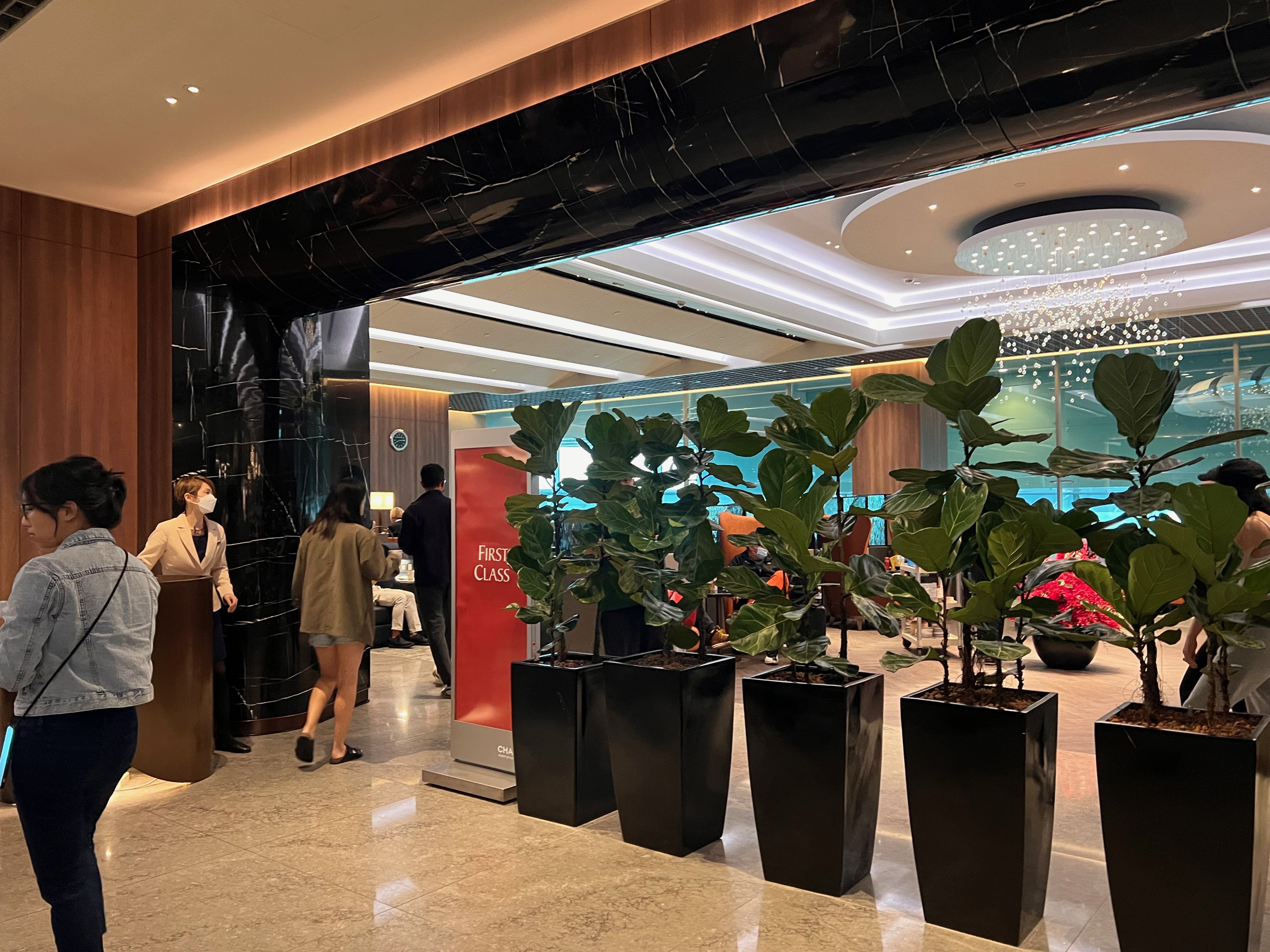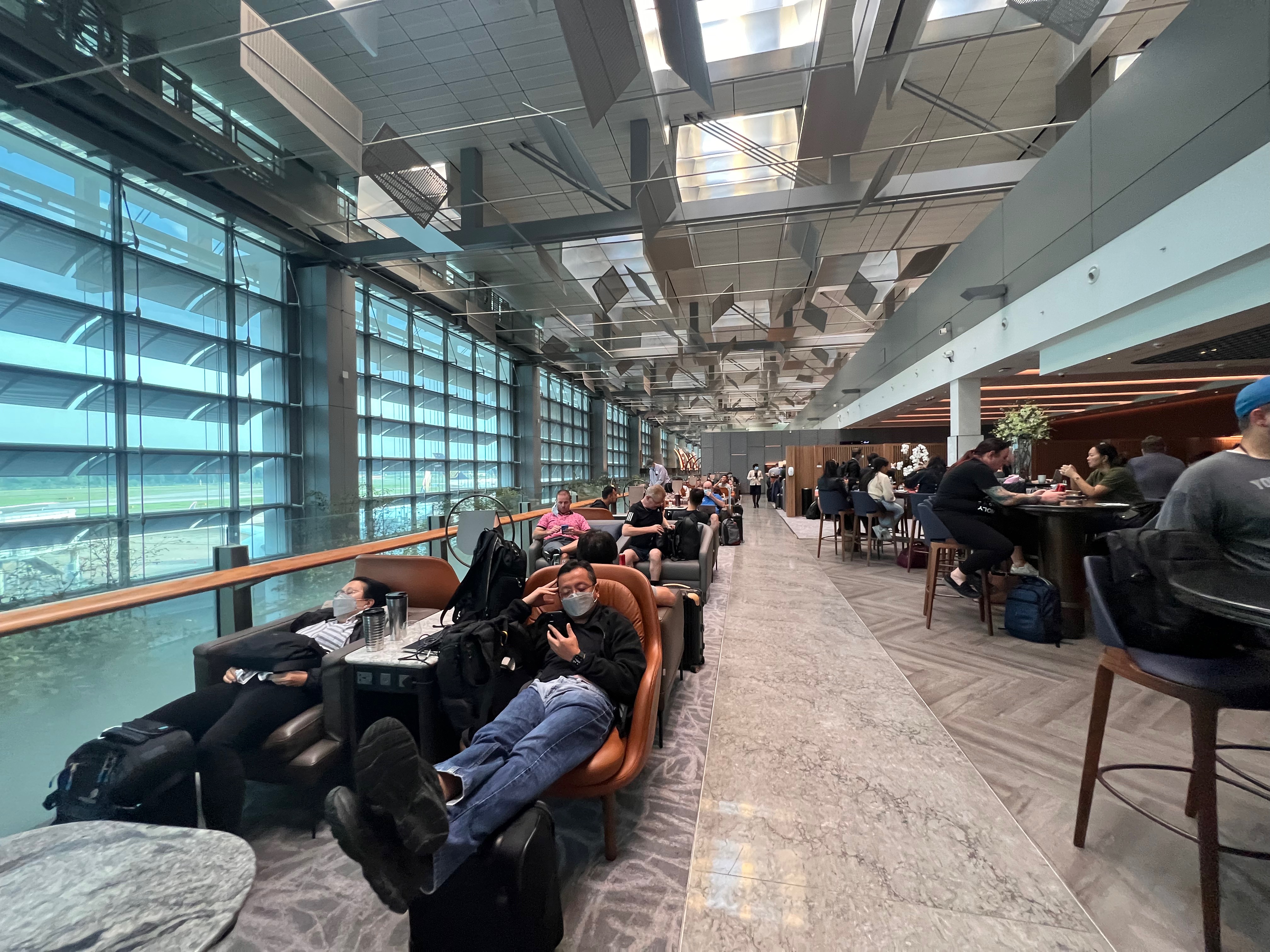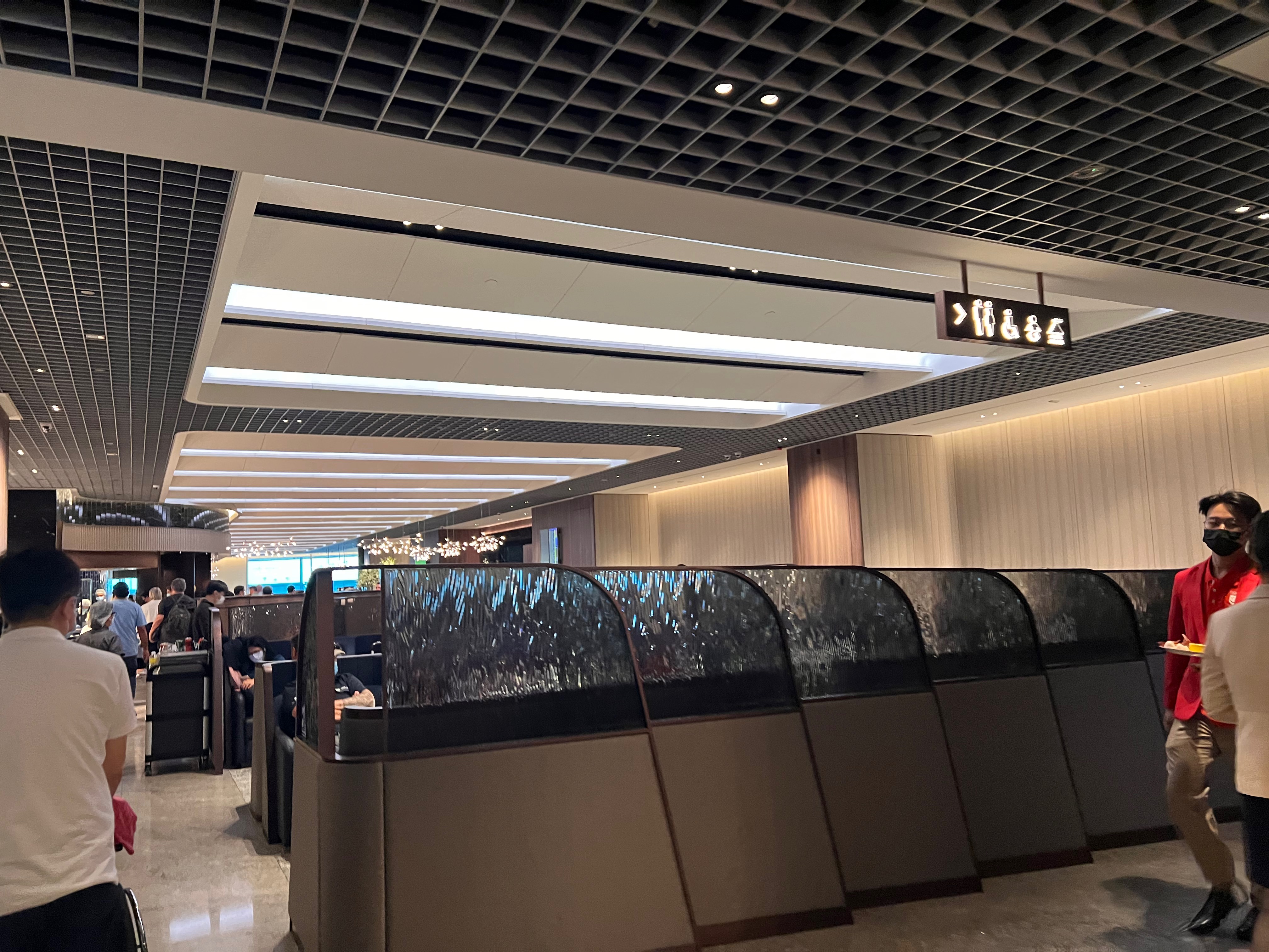 As KrisFlyer Elite Gold members, we were invited to use the KrisFlyer Gold Lounge. However, as the lounge was closed for renovation during our visit, we used the SilverKris Lounge instead, located next to the KrisFlyer Gold Lounge. The newly renovated SilverKris Lounge can be separated into two distinct areas. The area next to the entrance has more natural light and serves mainly as an area for passengers to lounge and relax, furnished with numerous armchairs. Further into the lounge, the other area serves more as a dining area and is furnished mainly with dining tables. Food is served buffet-style in the dining area, equipped with a brown and earthy tone. The entrance to the First Class lounge is also found in the dining area of the SilverKris Lounge. The SilverKris Lounge was very crowded during our visit to this lounge, and we had a hard time looking for empty seats.