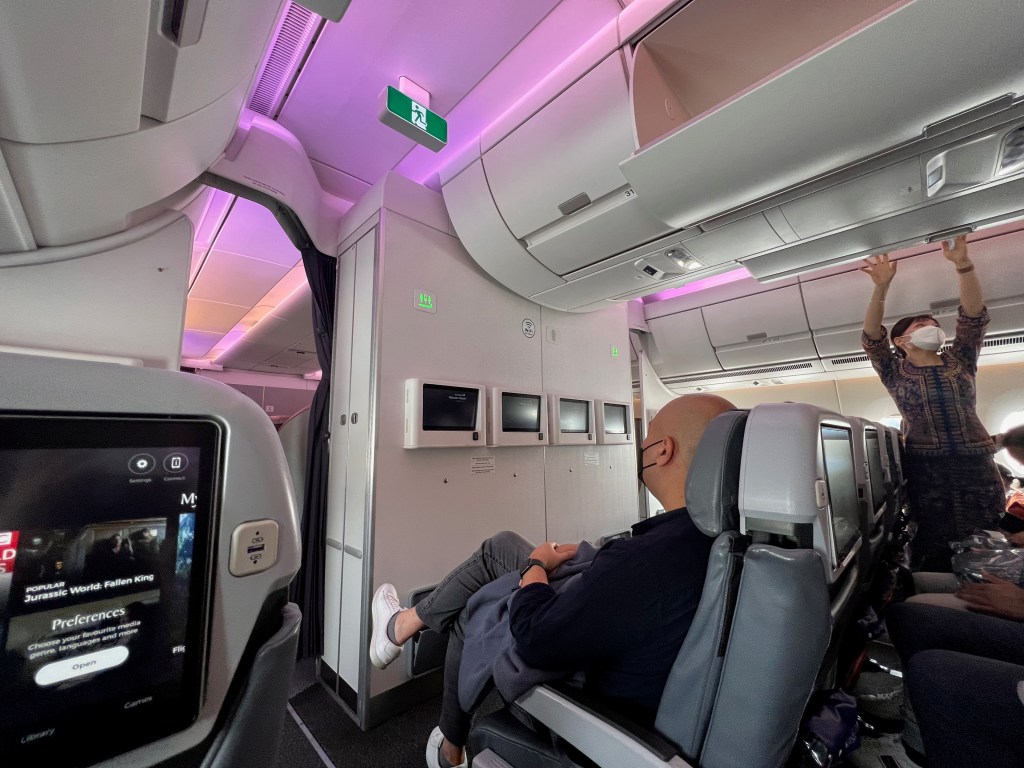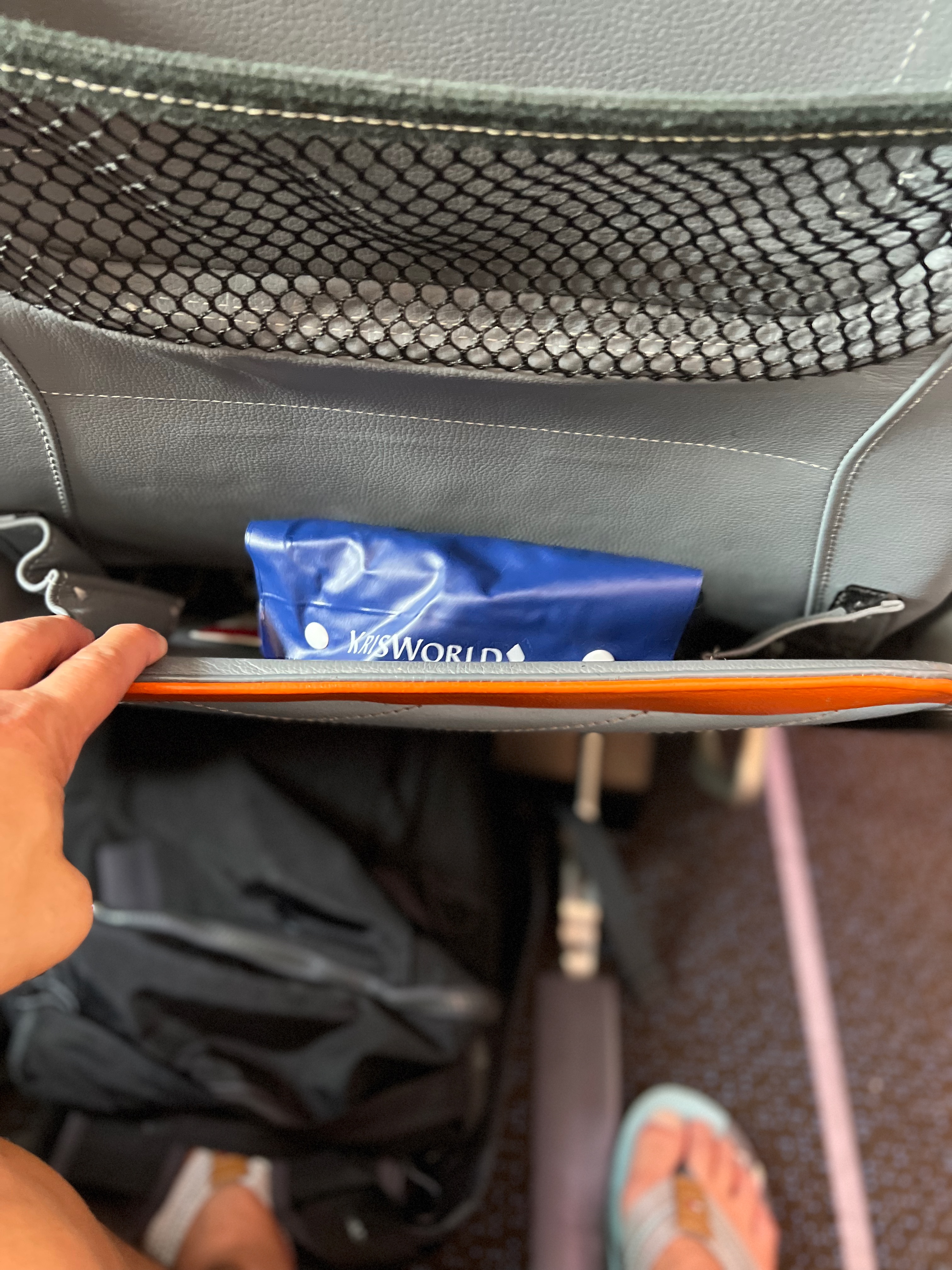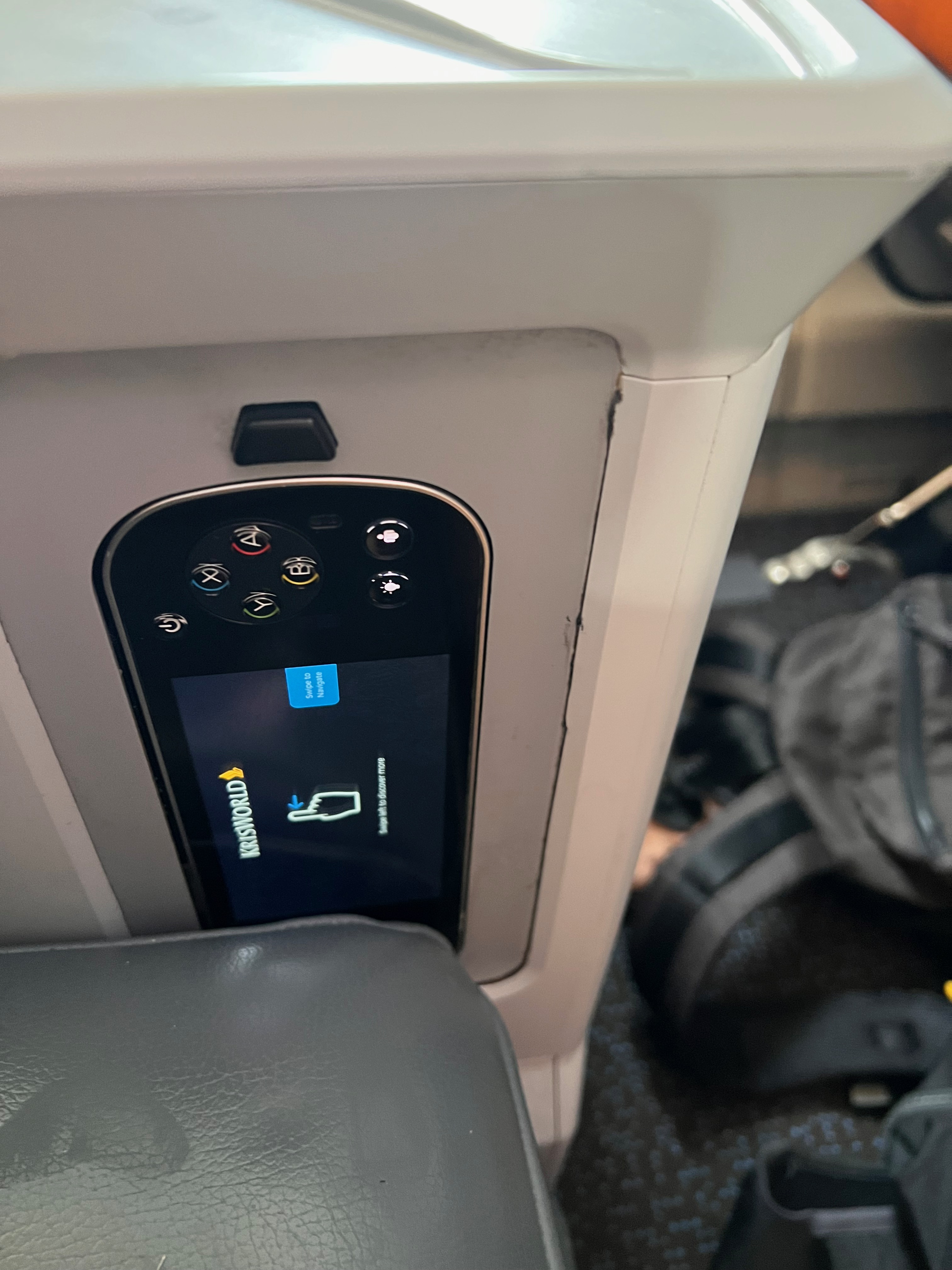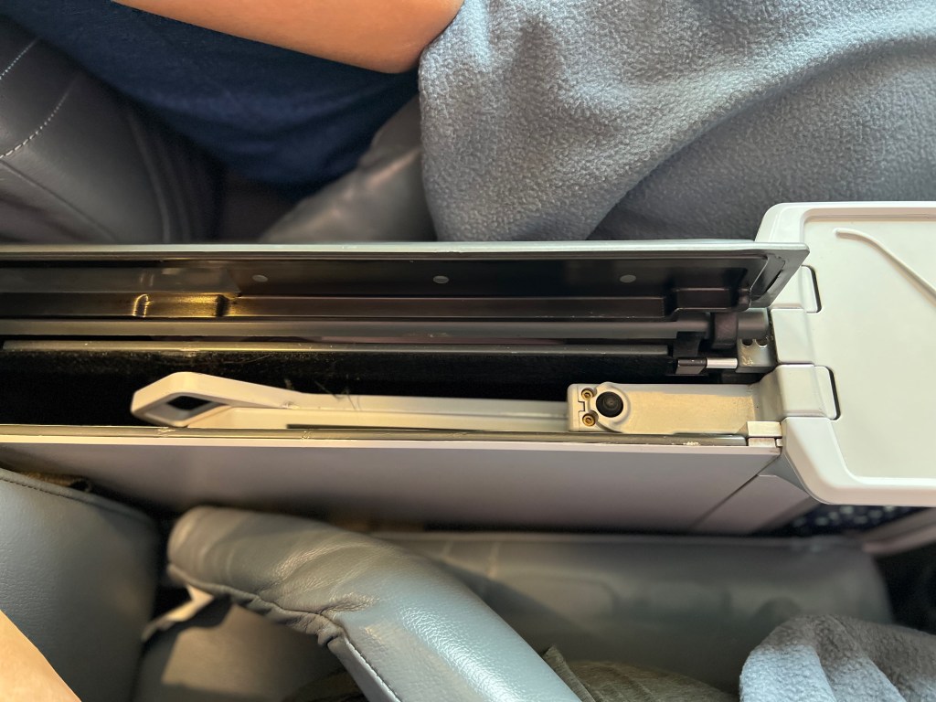 Stowed on the seat’s left, the IFE controller resembles a portable gaming device. The touchscreen area of the IFE controller is very responsive. I was able to display the content of the movie that I was watching or the flight map on the IFE controller without disrupting the show I was watching on the TV screen. The noise-cancelling headphones provided are the same as one would receive in Business Class. The headphones effectively block out noise, but putting them too long makes my ears feel uncomfortable.