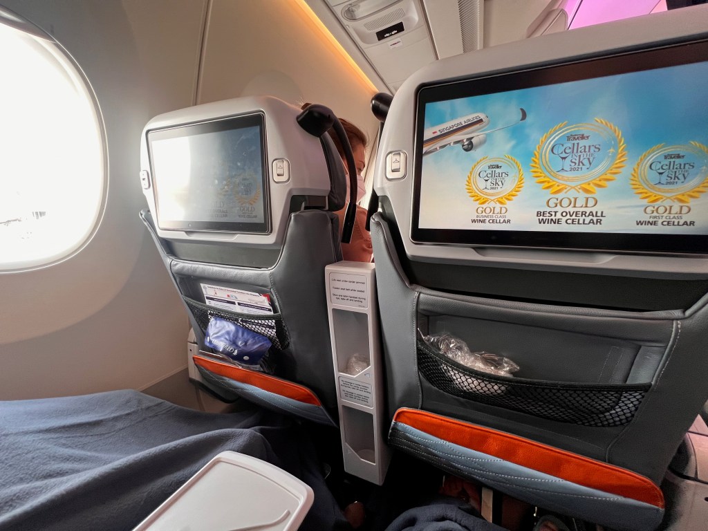 The Premium Economy Class seats onboard Singapore Airlines feel very comfortable. The grey leathered recliner seat has a pitch of 38″ and measures 19″ wide, providing me with excellent legroom. A pillow and fleece blanket was provided on each seat at boarding. There are two seat control buttons on the right armrests, one for adjusting the seat’s recline and the other for deploying the calfrest. I thought the calfrest and footrest made the ride on the Premium Economy Class even more comfortable. However, the footrest did not seem to be able to fully deploy when I stowed my carry-on bag under the seat in front of mine (it is advised to stow carry one baggage in the overhead bin to be able to utilise the footrest fully). However, the Premium Economy seat feels very comfortable when reclined and with the calfrest fully deployed. It is so cosy and comfortable that I dozed off after breakfast while watching the inflight movie.