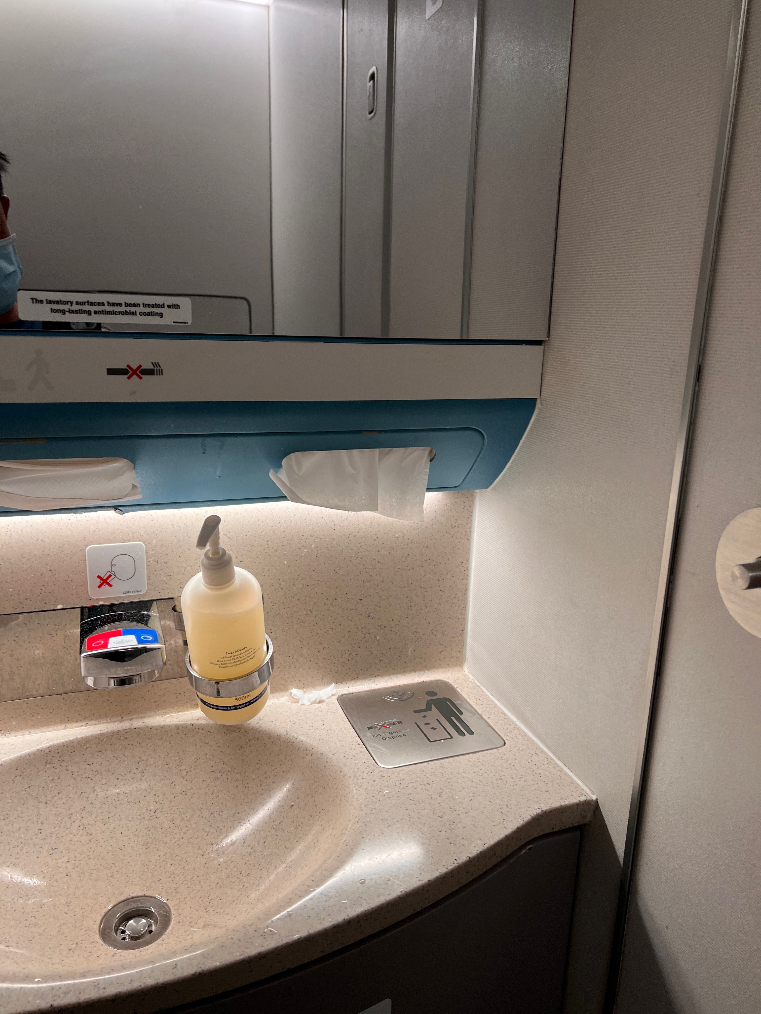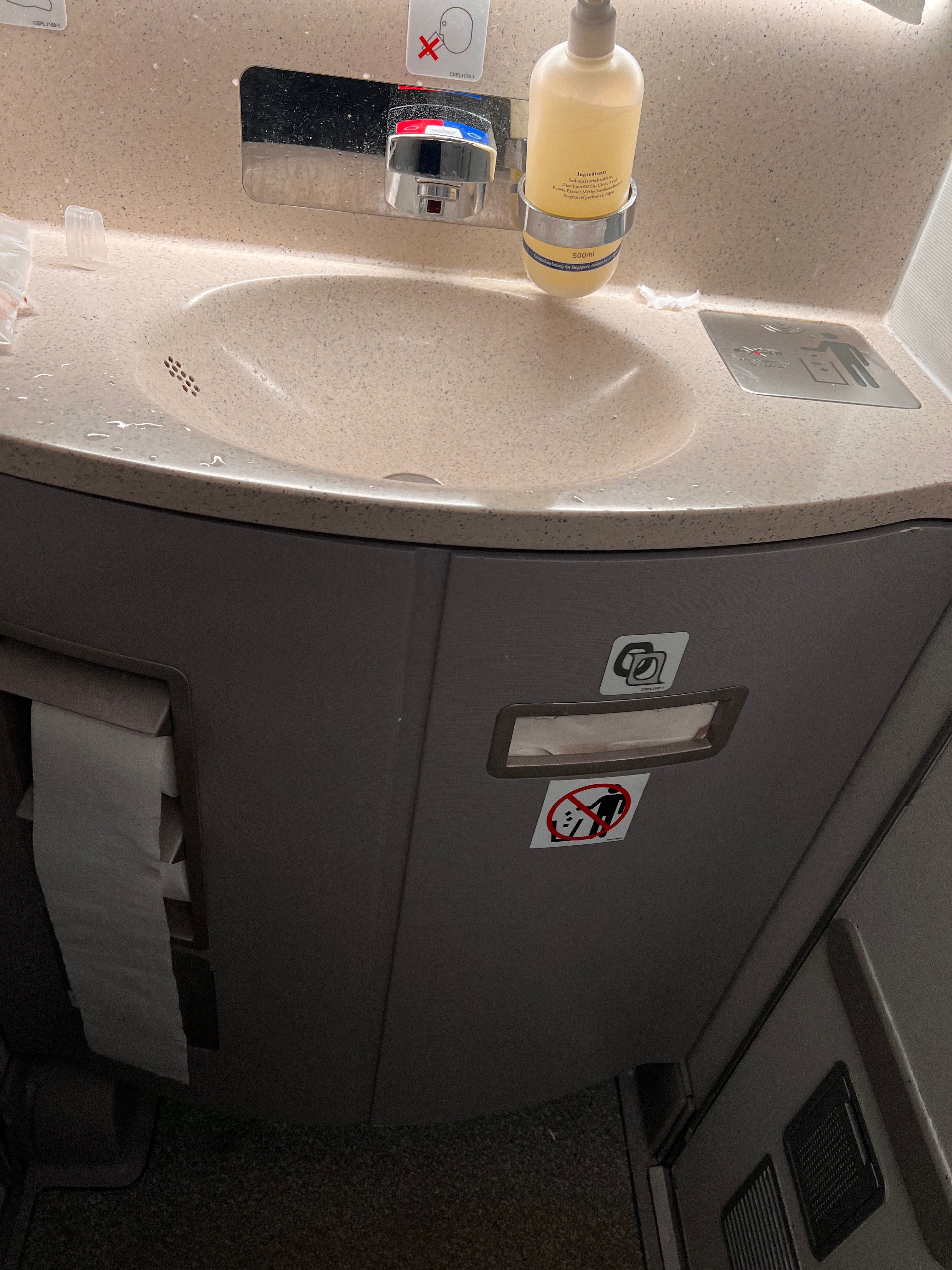 Passengers travelling in Premium Economy Class share the same lavatory as those in Economy Class. The nearest lavatory to the Premium Economy section is located at the rear of the forward Economy Class section. The lavatory feels small but sufficient for passengers to do their business. The lavatory is sparsely stocked with hand soap, a small bottle of facial mist and some toothbrushes. I was surprised to find Business Class toothbrushes in this lavatory; not too sure if it is intended or a way for Singapore Airlines to clear their Business Class toothbrush inventory. The lavatory was not kept clean by the cabin crew, probably due to the short flight and the passenger load. The lavatory floor felt sticky, and I spotted a used toothbrush on the sink top.