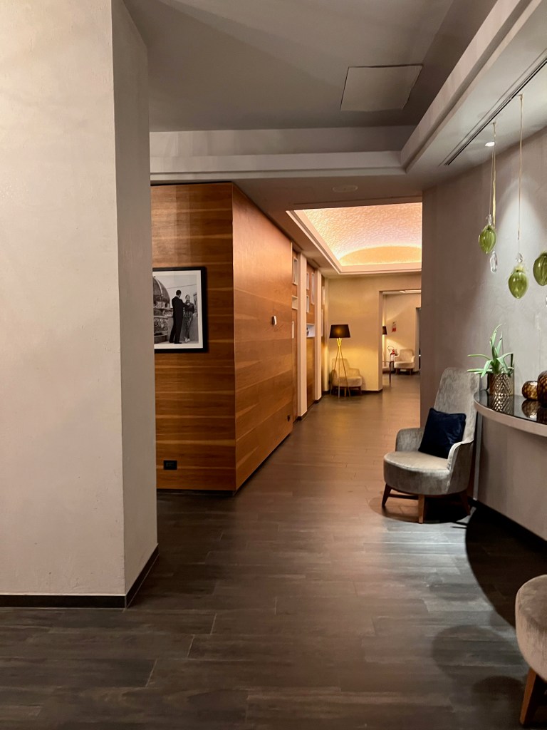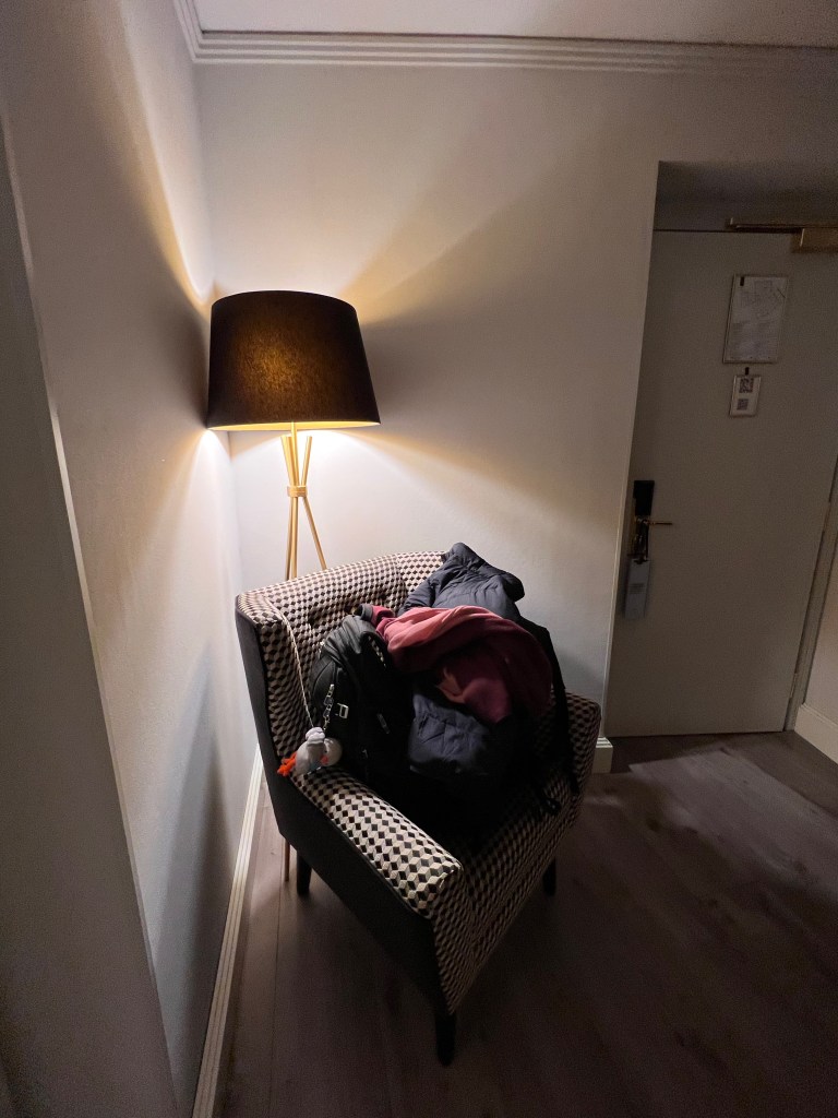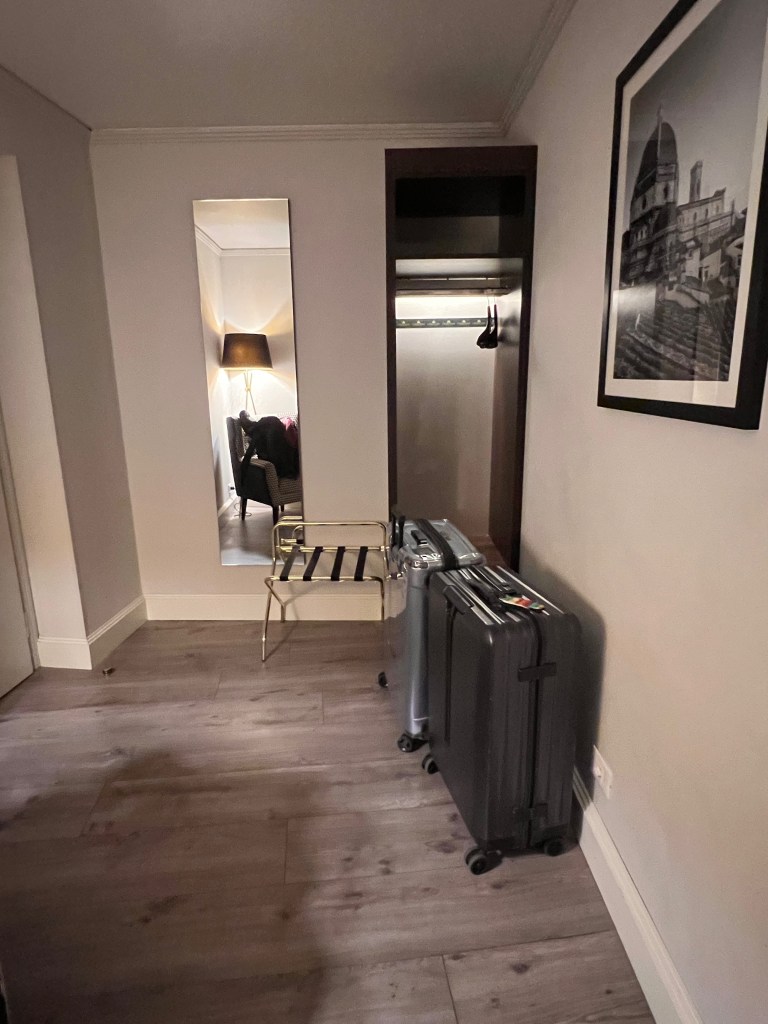 The Junior Suite at Hotel Cerretani Firenze has a dedicated entryway, a room with a door separating it from the rest of the suite, furnished with an armchair and a standing lamp. The chair in the entryway allows us to wear our shoes and is also great for relaxing and reading a book with the warm light from the lamp and the lighting in this room. There is an open wardrobe in the entryway, which is meant for us to hang our jackets. Despite being a small room, there is sufficient space for us to place one of our luggage with the luggage rack in the suite.
