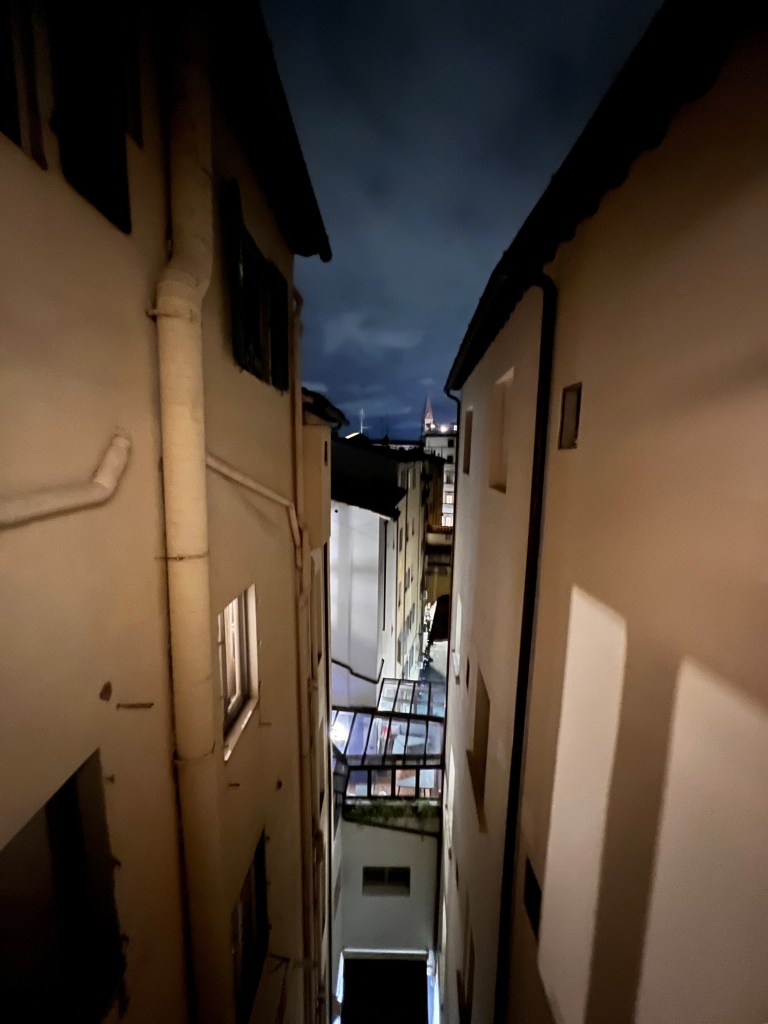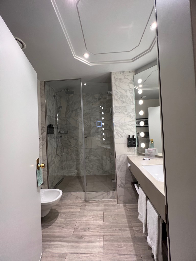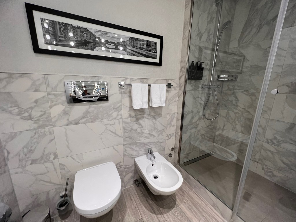 The theme in the bathroom is different from the rest of the suite. While the suite exudes a contemporary and warm vibe, the bathroom oozes an industrial and functional feel. The sink sits on an open two-tiered cabinet tucked against the bathroom wall. I like how the hotel decided to go with one sink instead of a dual sink concept due to space limitations in the Junior suite. This design also afforded us plenty of space on the sink countertop to place our toiletries without feeling cramped. The body lotion and hand wash are mounted onto the wall to save more space on the sink countertop. The use of a large Hollywood-style mirror not only brightens the whole space but also makes the bathroom looks bigger than it is. The toilet and a separate bidet are mounted onto the wall opposite the sink countertop, leaving a lot of space for guests to walk and use the bathroom. The photo of Ponte Vecchio hanging above the toilet and bidet Hotel Cerretani Firenze not only constantly reminded us that we were in Florence but also removed the bathroom’s dullness.