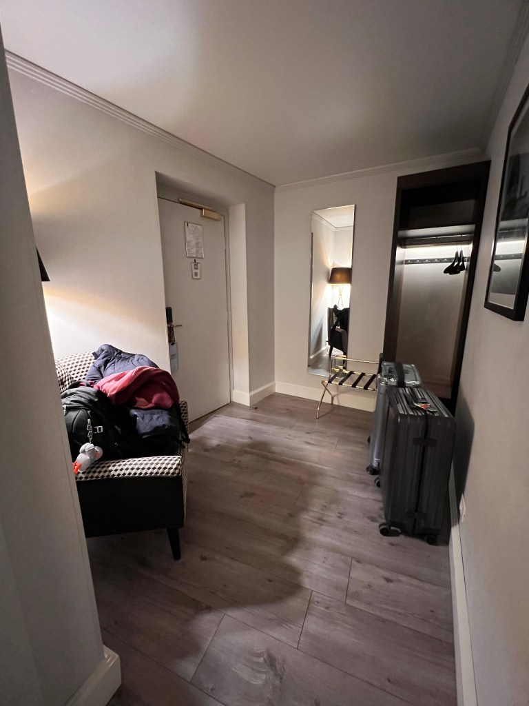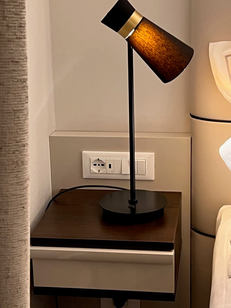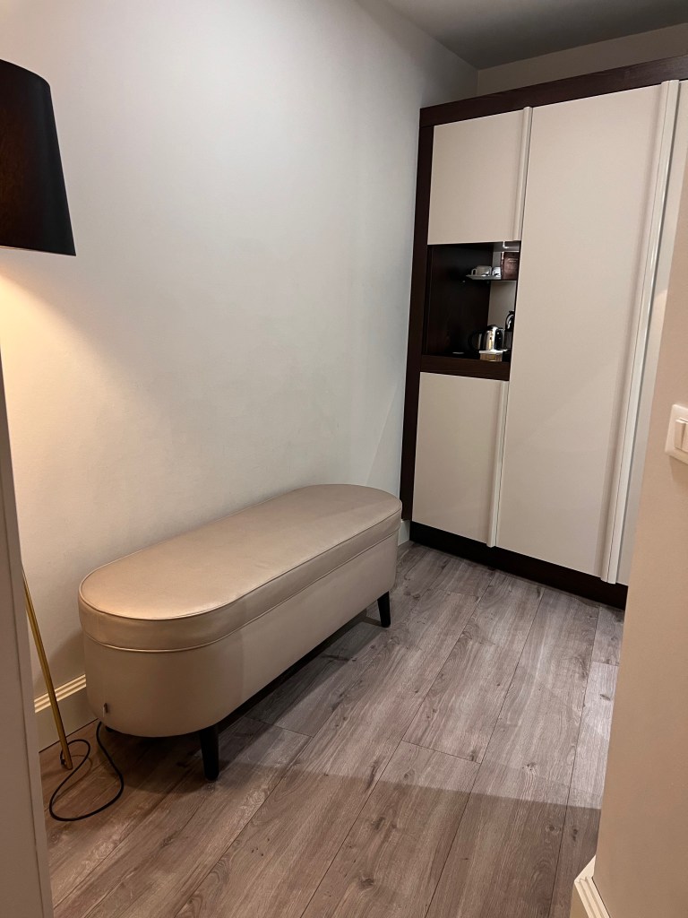 A beige-coloured leathered bench sat beside another floor lamp right before the wardrobe. I find the placement of this bench weird, as it just faces an empty wall. It seems Hotel Cerretani Firenze is trying to fit a sofa to satisfy some form of checklist that mandates a sofa must be in a Junior Suite. Unfortunately, the placement of the bench serves no purpose other than to take up precious real estate in the compact Junior Suite. Nevertheless, we found a use for this bench to place one of our luggage.
