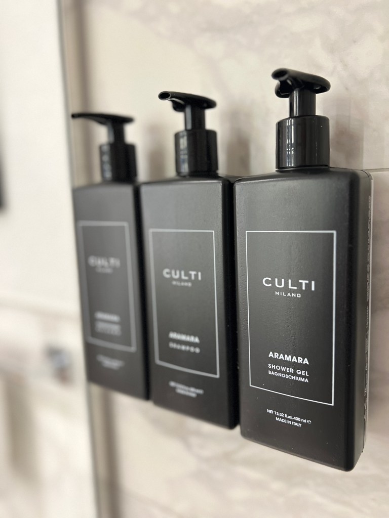 The walk-in shower is tucked in the innermost space of the bathroom, separated by a glass panel clad in white marble with a light grey pattern. The walk-in shower is rather sizeable, which gives us plenty of space when showering. The walk-in shower features both regular and rainfall shower heads. The water pressure is great, and the hot water works perfectly. The hotel uses Milanese brand CULTI shower amenities mounted onto the wall, freeing up space for us to place our toothbrushes and facial washes onto the silver rack mounted in one corner of the bathroom. I favour the decision of Hotel Cerretani Firenze not installing a bathtub in the bathroom owing to the lack of space. Having a bathtub or a bath and shower combination will inevitably sacrifice the useable space in the bathroom.
