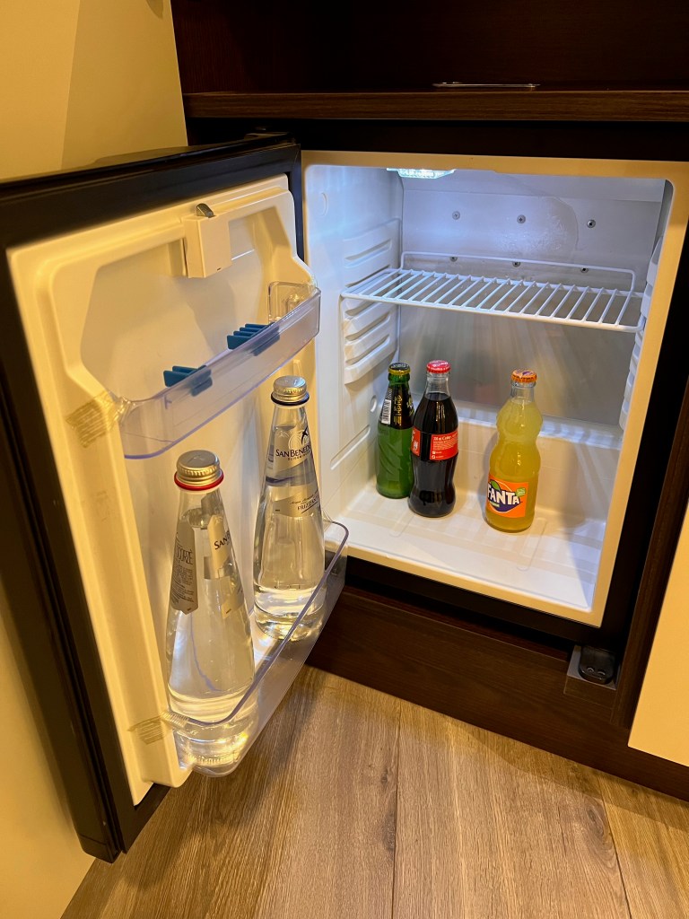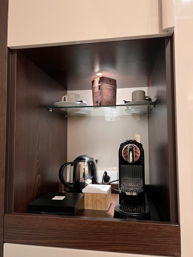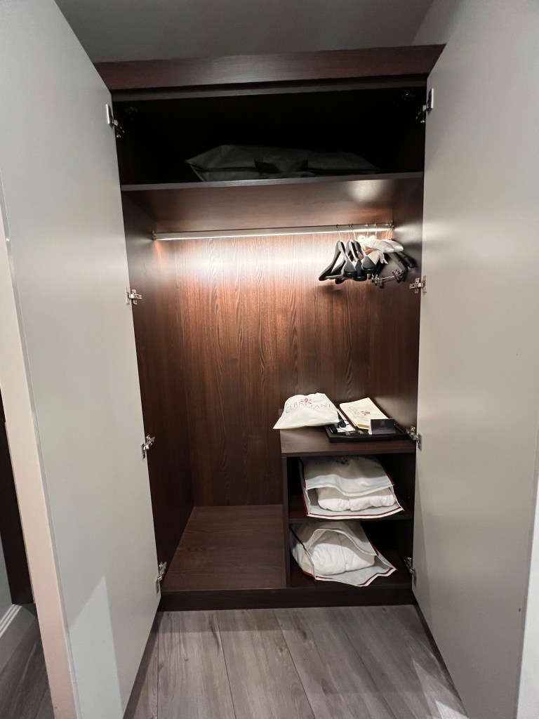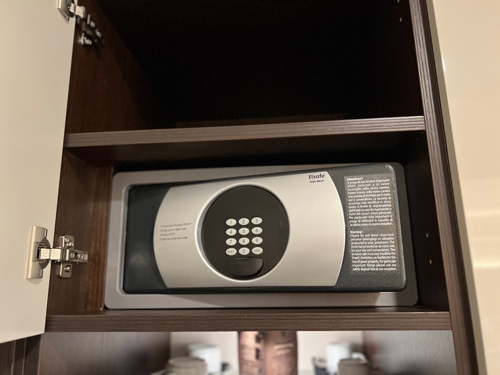A three-panelled cabinet sits at the end of a small corridor that houses the wardrobe and minibar in front of the entrance to the bathroom. The wardrobe occupied two panels, providing limited storage space for two guests staying in the Junior Suite at Hotel Cerretani Firenze. The wardrobe space is only sufficient for guests to put away at most five days of clothing. I also find the hangers supplied by the hotel to be a tad limited, and we had to request extra hangers from the hotel reception. A two-tiered open shelving inside the wardrobe maximises the amount of storage in the wardrobe. The hotel maximises the cabinet by fitting the minibar within one cabinet panel. The suite came equipped with a Nespresso machine, placed on the open shelving of the minibar area. The minifridge is tucked inside a cabinet space on the lower tier of the shelf, while the in-room safe took the top shelf.
